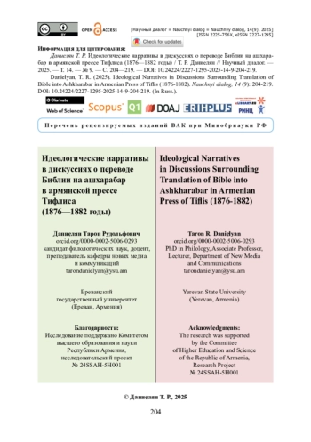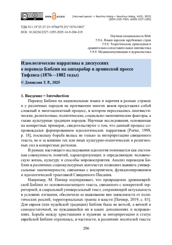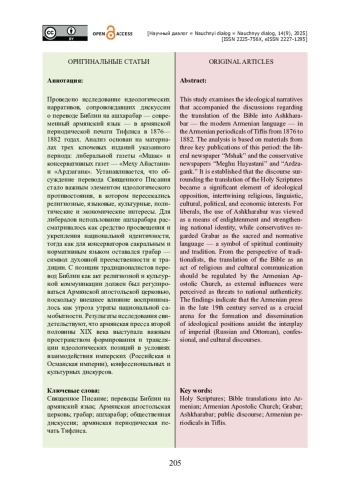 Проведено исследование идеологических нарративов, сопровождавших дискуссии о переводе Библии на ашхарабар — современный армянский язык — в армянской периодической печати Тифлиса в 1876— 1882 годах. Анализ основан на материалах трех ключевых изданий указанного периода: либеральной газеты «Мшак» и консервативных газет — «Меху Айастани» и «Ардзаганк». Устанавливается, что обсуждение перевода Священного Писания стало важным элементом идеологического противостояния, в котором пересекались религиозные, языковые, культурные, политические и экономические интересы. Для либералов использование ашхарабара рассматривалось как средство просвещения и укрепления национальной идентичности, тогда как для консерваторов сакральным и нормативным языком оставался грабар — символ духовной преемственности и традиции. С позиции традиционалистов перевод Библии как акт религиозной и культурной коммуникации должен был регулироваться Армянской апостольской церковью, поскольку внешнее влияние воспринималось как угроза утраты национальной самобытности. Результаты исследования свидетельствуют, что армянская пресса второй половины XIX века выступала важным пространством формирования и трансляции идеологических позиций в условиях взаимодействия имперских (Российская и Османская империи), конфессиональных и культурных дискурсов.