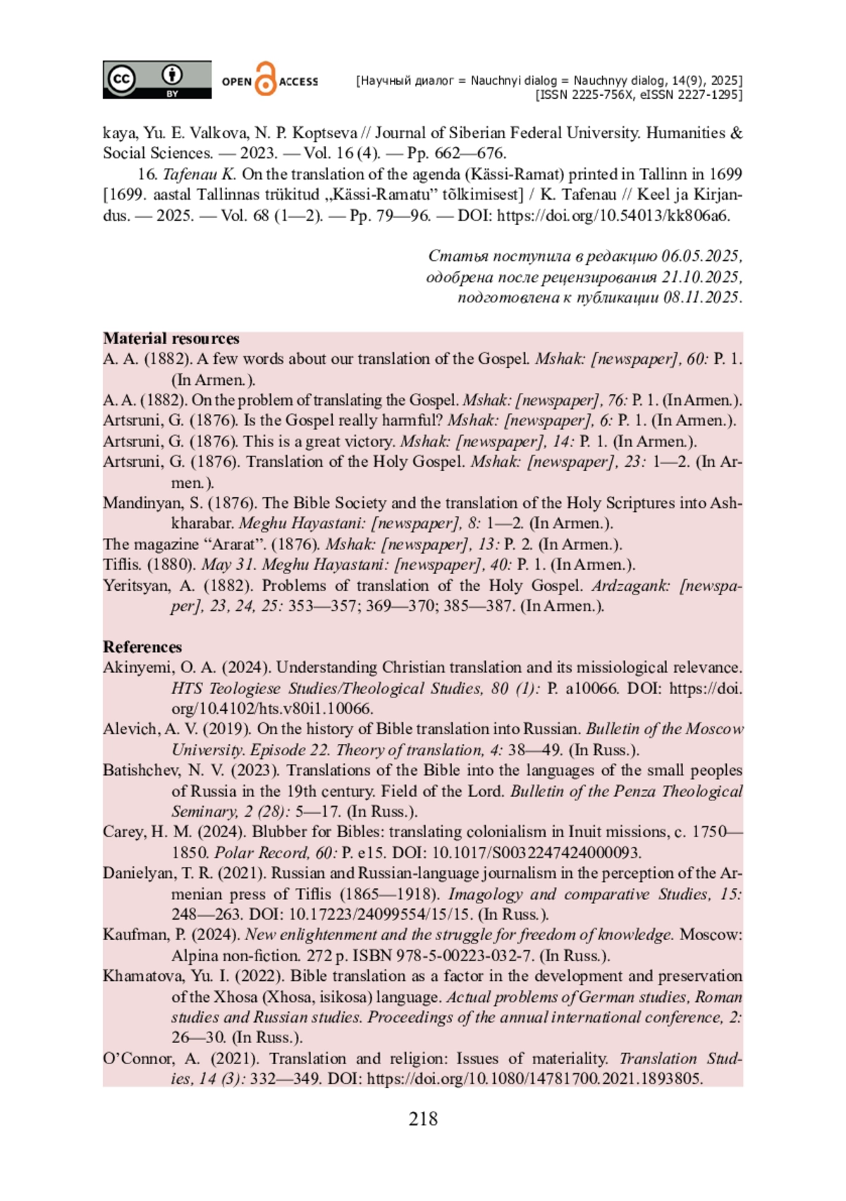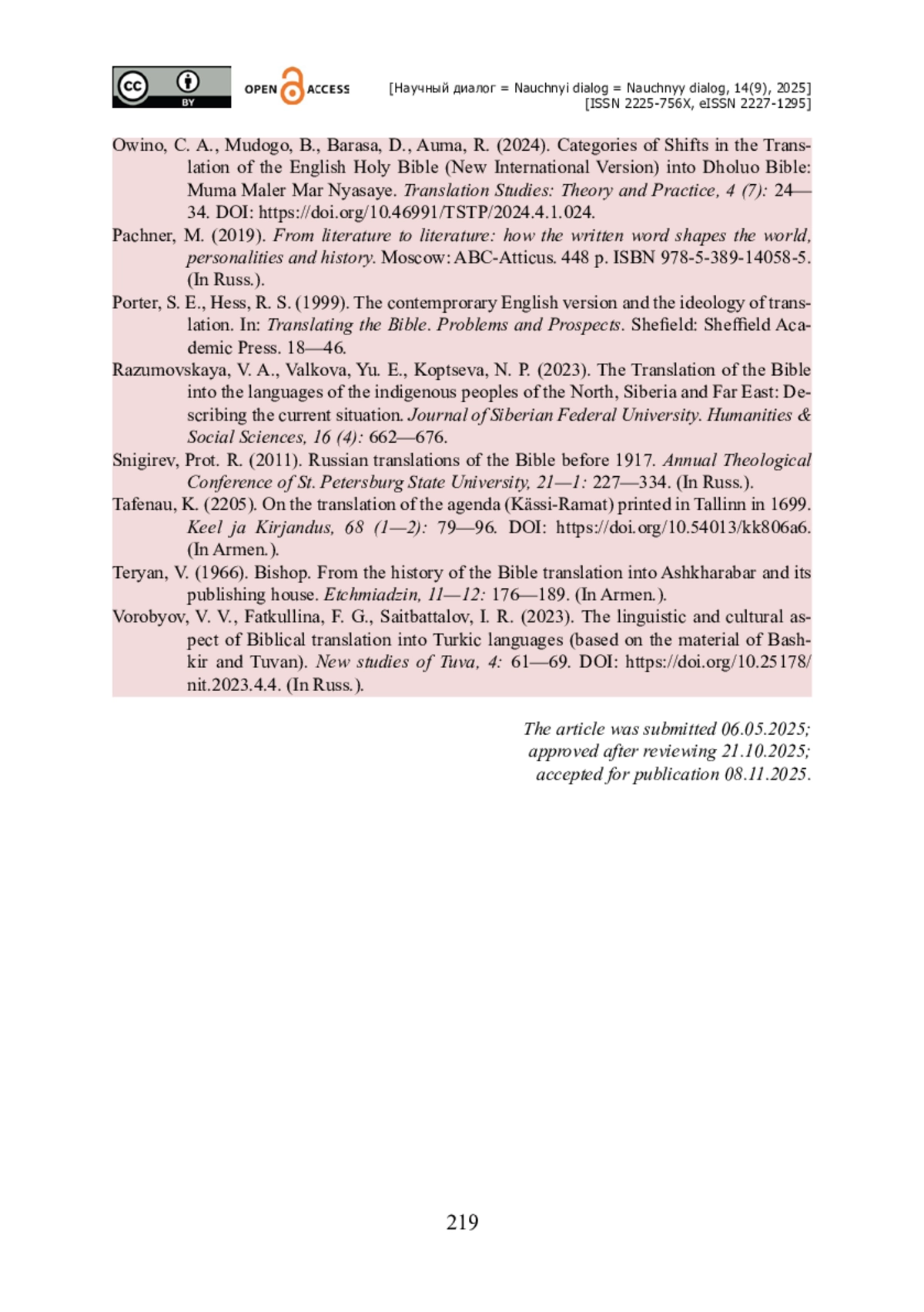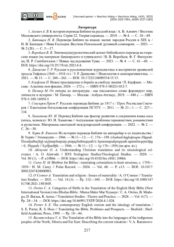 24. Razumovskaya V. A. The Translation of the Bible into the languages of the indigenous peoples of the North, Siberia and Far East: Describing the current situation / V. A. Razumovskaya, Yu. E. Valkova, N. P. Koptseva // Journal of Siberian Federal University. Humanities & Social Sciences. - 2023. - Vol. 16 (4). - Pp. 662-676.