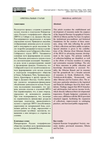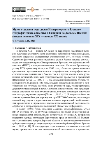 Исследуется процесс создания и развития музеев отделов и подотделов Императорского Русского географического общества (ИРГО) в Сибири и на Дальнем Востоке. Рассматриваются предпосылки и история учреждения музеев. Приводятся сведения, отображающие динамику роста их коллекций и популярности среди населения. Более подробно раскрывается вклад в развитие музейного дела Сибирского (Восточно-Сибирского) отдела ИРГО. Указываются основные пути формирования его коллекций. Показана деятельность членов отдела по систематизации коллекций. Оценивается роль музея в распространении знаний и просвещении граждан. Отмечается, что Сибирский отдел и его музей положили начало формированию сети музеев отделов и подотделов географического общества в Омске, Хабаровске, Чите, Троицкосавске-Кяхте, Красноярске и других городах Сибири и Дальнего Востока. Особое внимание уделяется материально-финансовому обеспечению деятельности музеев. Результаты исследования показывают, что уровень доходов отделов и отделений ИРГО был неравномерным, что, в свою очередь, определяло их возможности развития. При этом подчеркивается, что, несмотря на ограниченность финансовых ресурсов некоторых подотделов, принадлежность музеев к структуре ИРГО способствовала укреплению их материальной базы, улучшению работы по сбору, определению и каталогизации музейных экспонатов, повышению к ним интереса со стороны населения.