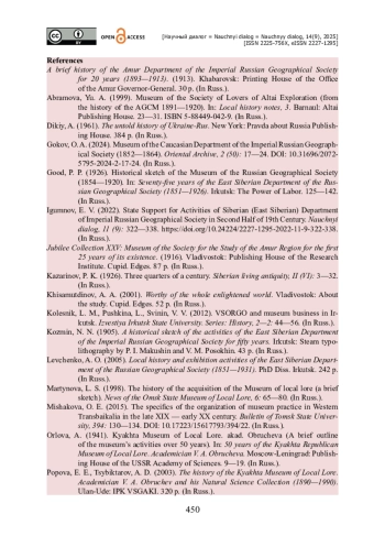 33. Гоков О. А. Музеум Кавказского отдела Императорского Русского географического общества (1852-1864 гг.) / О. А. Гоков // Восточный архив. - 2024. - № 2 (50). - С. 17-24. - https://doi.org/10.31696/2072-5795-2024-2-17-24.