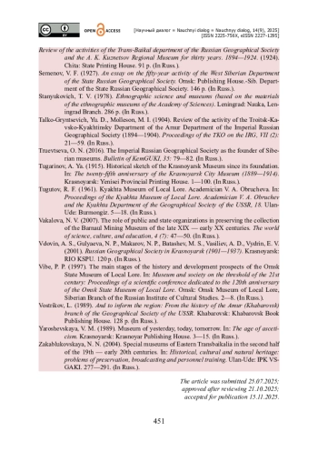 51. Труевцева О. Н. Императорское Русское географическое общества как основатель сибирских музеев / О. Н. Труевцева // Вестник КемГУКИ. - 2016. - № 35. - С. 79-82.