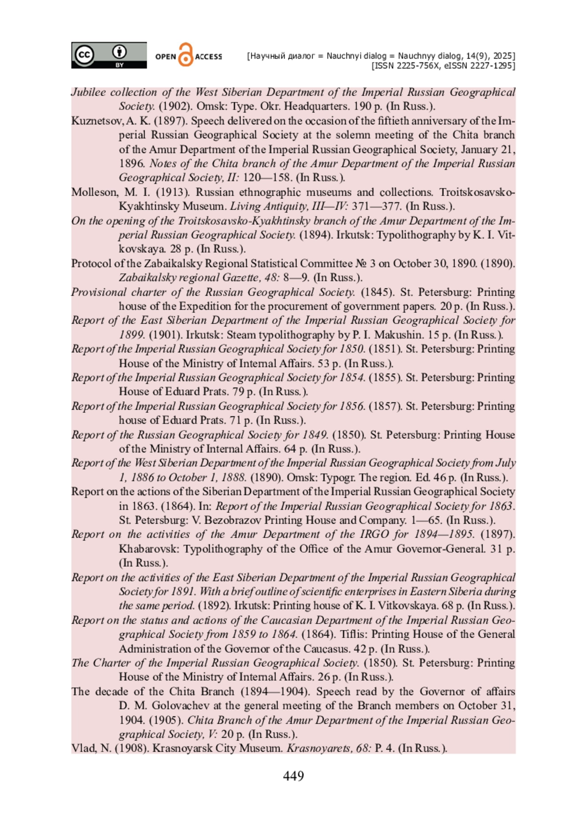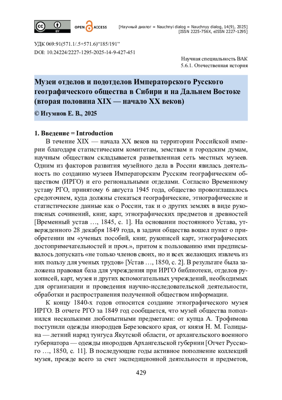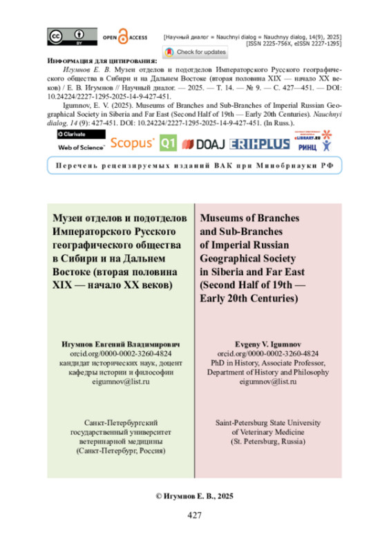 36. Игумнов Е. В. Государственная поддержка деятельности Сибирского (Восточно-Сибирского) отдела Императорского Русского географического общества во второй половине XIX века / Е. В. Игумнов // Научный диалог. - 2022. - Т. 11. - № 9. - С. 322-338. - https://doi.org/10.24224/2227-1295-2022-11-9-322-338.