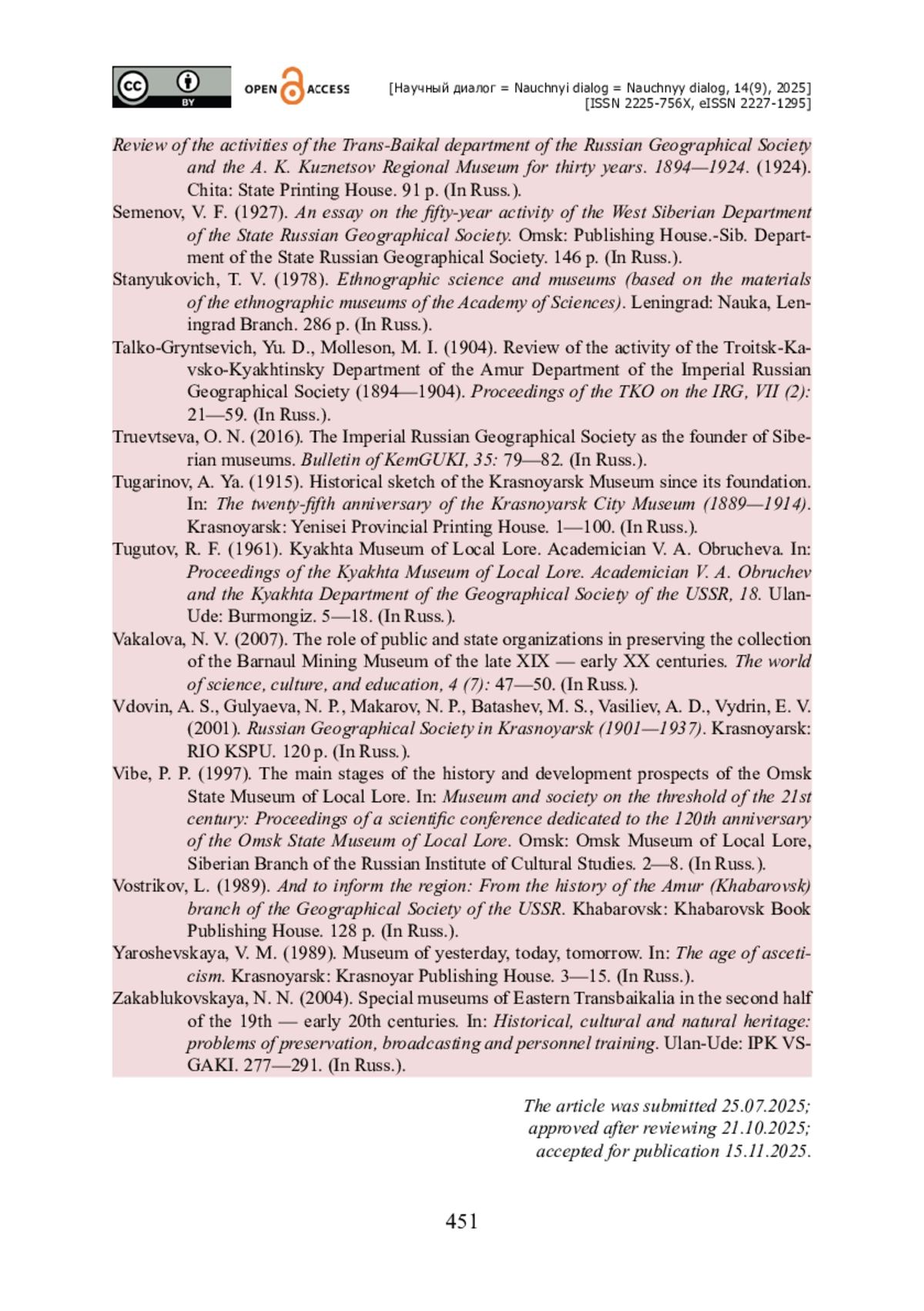 35. Закаблуковская Н. Н. Специальные музеи Восточного Забайкалья во второй половине XIX - начале XX вв. / Н. Н. Закаблуковская // Историко-культурное и природное наследие : проблемы сохранения, трансляции и подготовки кадров. - Улан-Удэ : ИПК ВСГАКИ, 2004. - С. 277-291.