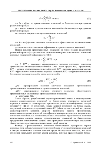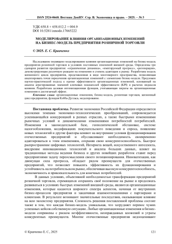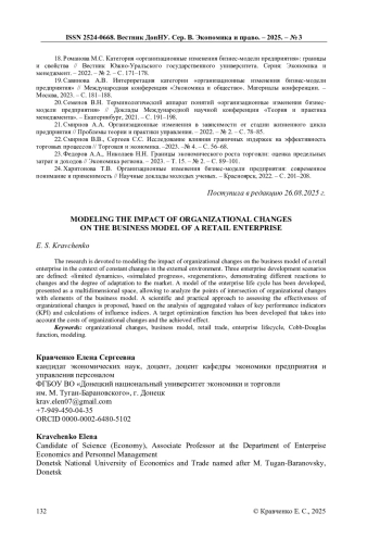 Исследование посвящено моделированию влияния организационных изменений на бизнес-модель предприятия розничной торговли в условиях постоянных изменений внешней среды. Определены три сценария развития предприятия: «ограниченная динамика», «имитируемый прогресс», «регенерация», демонстрирующие различную реакцию на изменения и степень адаптации к рынку. Разработана модель жизненного цикла предприятия, представленная в виде многомерного пространства, позволяющая анализировать точки пересечения организационных изменений с элементами бизнес-модели. Предложен научно-практический подход к оценке эффективности организационных изменений, основанный на анализе агрегированных значений ключевых показателей эффективности (KPI) и расчетах индексов влияния. Разработана целевая оптимизационная функция, учитывающая затраты на организационные изменения и достигаемый эффект.
