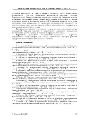 4. Демидов А.К. Характеристика организационных изменений бизнес-модели предприятия // Экономика и управление народным хозяйством. - 2023. - № 3. - С. 25-32.