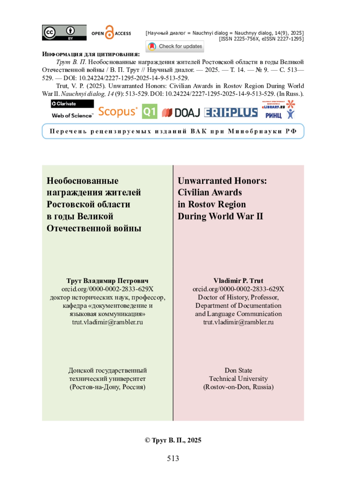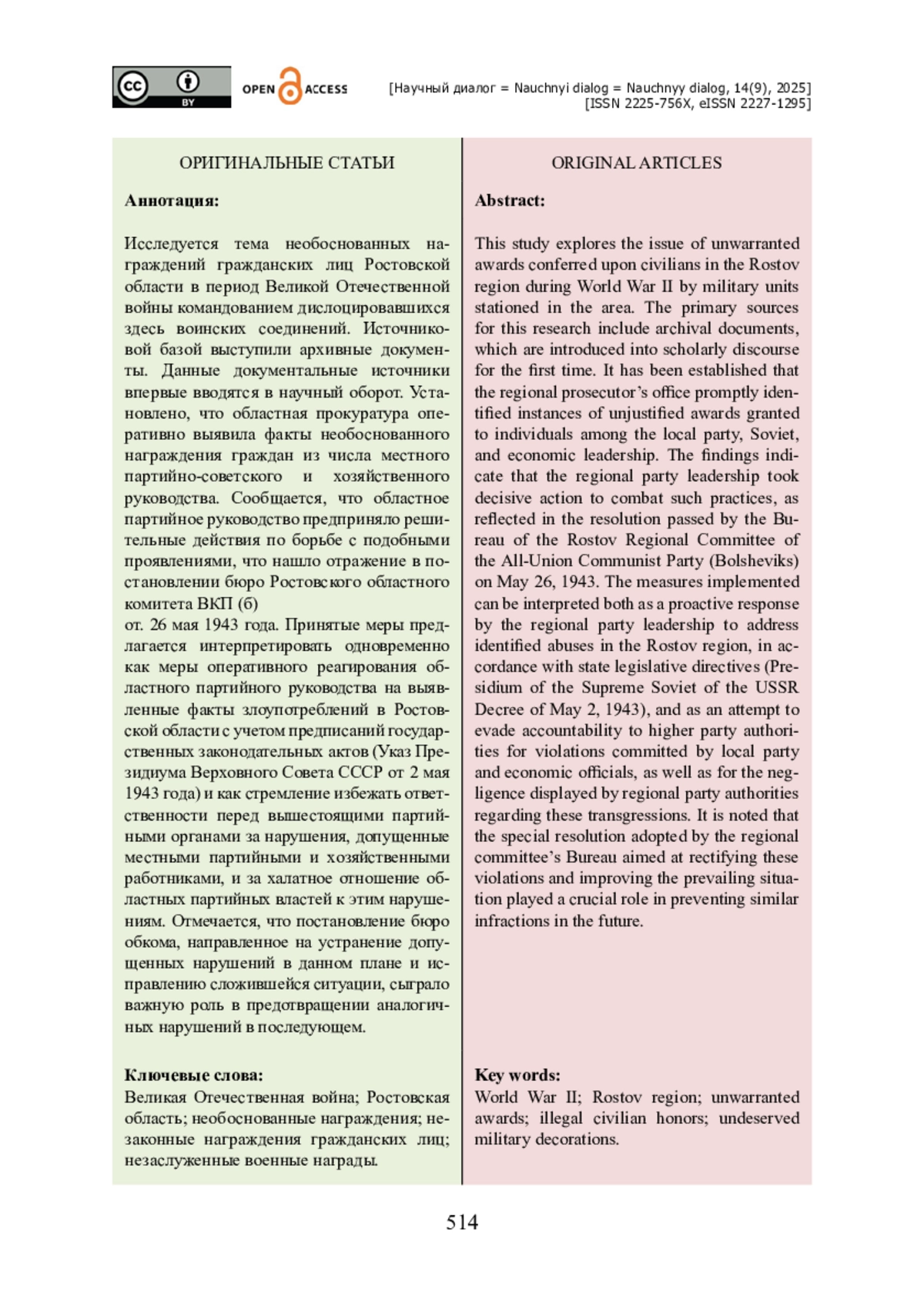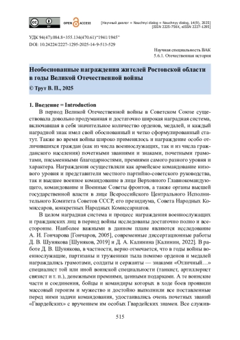 Исследуется тема необоснованных награждений гражданских лиц Ростовской области в период Великой Отечественной войны командованием дислоцировавшихся здесь воинских соединений. Источниковой базой выступили архивные документы. Данные документальные источники впервые вводятся в научный оборот. Установлено, что областная прокуратура оперативно выявила факты необоснованного награждения граждан из числа местного партийно-советского и хозяйственного руководства. Сообщается, что областное партийное руководство предприняло решительные действия по борьбе с подобными проявлениями, что нашло отражение в постановлении бюро Ростовского областного комитета ВКП (б) от. 26 мая 1943 года. Принятые меры предлагается интерпретировать одновременно как меры оперативного реагирования областного партийного руководства на выявленные факты злоупотреблений в Ростовской области с учетом предписаний государственных законодательных актов (Указ Президиума Верховного Совета СССР от 2 мая 1943 года) и как стремление избежать ответственности перед вышестоящими партийными органами за нарушения, допущенные местными партийными и хозяйственными работниками, и за халатное отношение областных партийных властей к этим нарушениям. Отмечается, что постановление бюро обкома, направленное на устранение допущенных нарушений в данном плане и исправлению сложившейся ситуации, сыграло важную роль в предотвращении аналогичных нарушений в последующем.