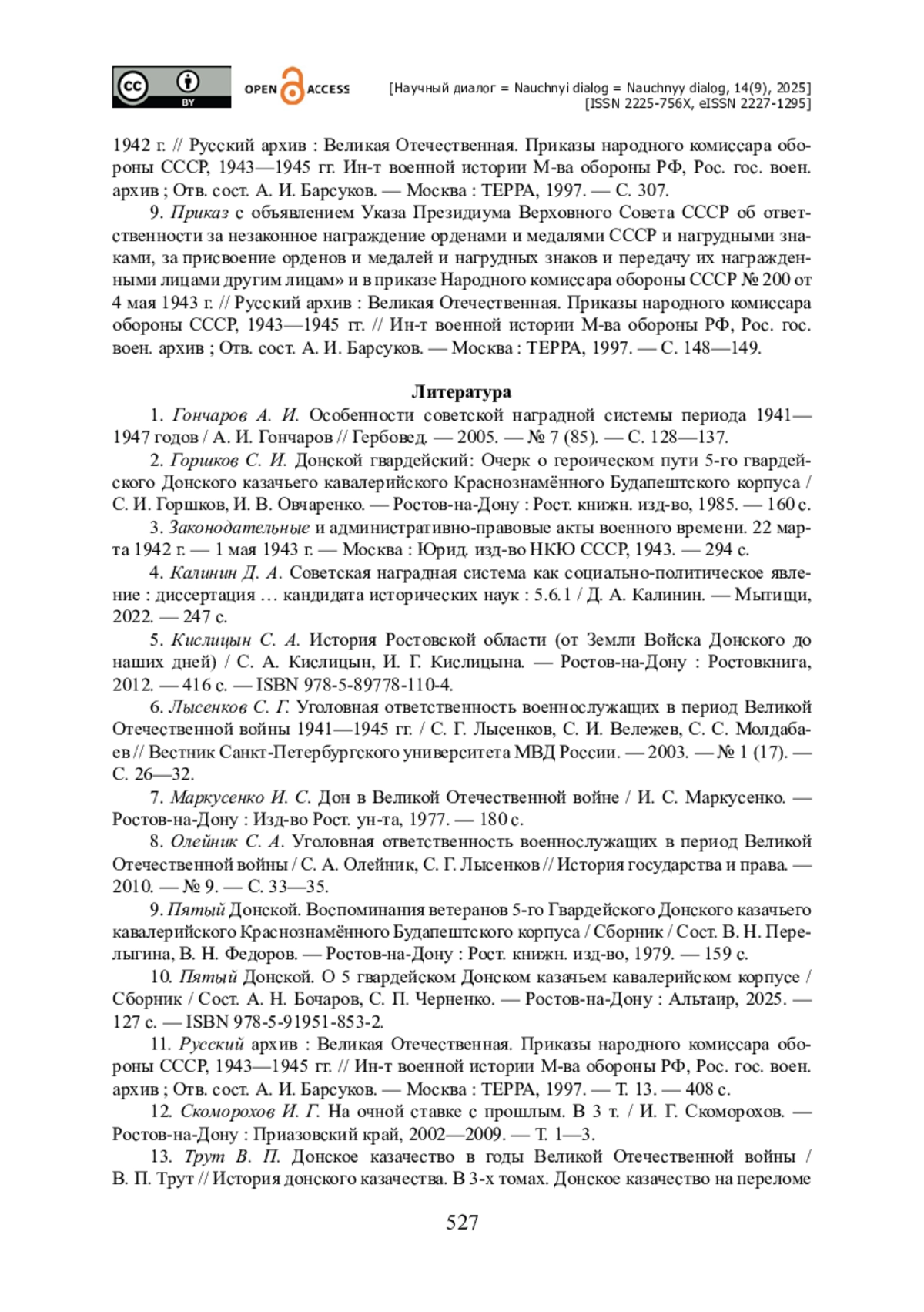 10. Гончаров А. И. Особенности советской наградной системы периода 1941- 1947 годов / А. И. Гончаров // Гербовед. - 2005. - № 7 (85). - С. 128-137.