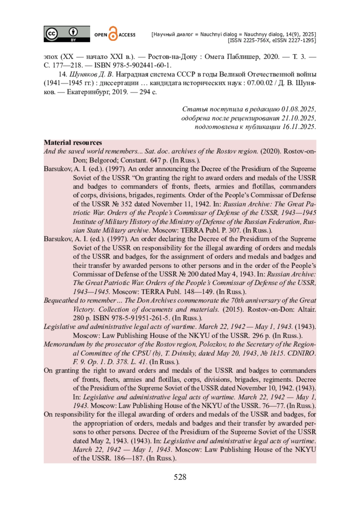 23. Шуняков Д. В. Наградная система СССР в годы Великой Отечественной войны (1941-1945 гг.) : диссертации … кандидата исторических наук : 07.00.02 / Д. В. Шуняков. - Екатеринбург, 2019. - 294 с.