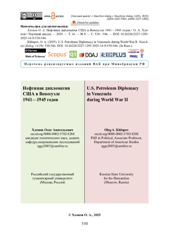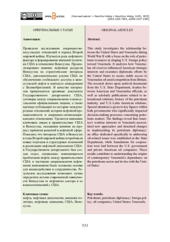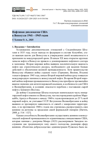 Проведено исследование американо-венесуэльских отношений в период Второй мировой войны. Изучается роль нефтяного фактора в формировании внешней политики США в отношении Венесуэлы. Проанализировано влияние нефтяных ресурсов Венесуэлы на стратегические интересы США, дипломатические усилия США по обеспечению стабильного доступа к венесуэльской нефти в контексте конкуренции с Великобританией. В качестве материалов привлекаются архивные документы Государственного департамента США, договоры между американскими и венесуэльскими официальными лицами, а также научные публикации по истории международных отношений, истории нефтяной промышленности и американо-латиноамериканским отношениям. Уделяется внимание ключевым лицам в правительствах США и Венесуэлы, оказавшим влияние на процесс принятия решений в нефтяной сфере. Показано, что интересы США в Венесуэле в годы Второй мировой войны потребовали новых подходов и структурных изменений в реализации нефтяной дипломатии США: в Государственном департаменте был создан отдел, специально занимающегося проблемами нефти; между правительством США и частными американскими нефтяными компаниями были заложены основы для взаимодействия и сотрудничества. Результаты исследования позволяют лучше определить истоки современной зависимости Венесуэлы от нефтяного сектора и ее взаимоотношений с США.