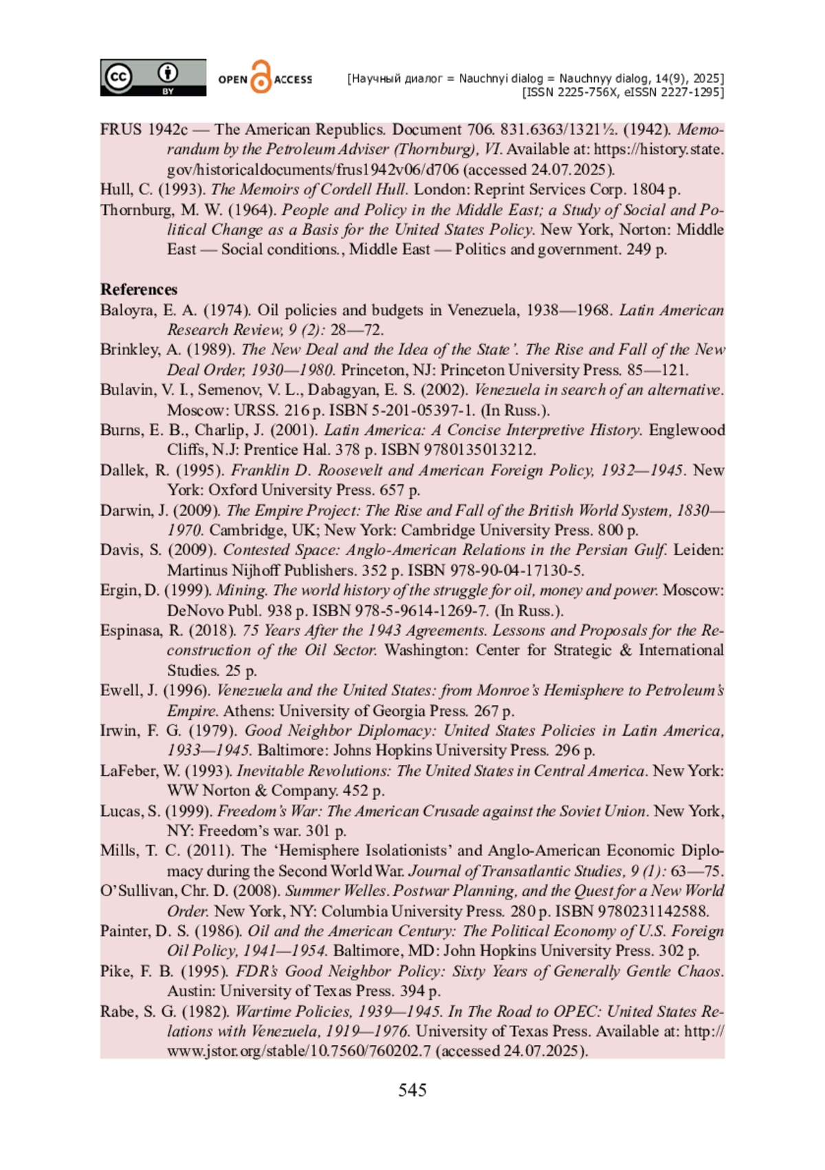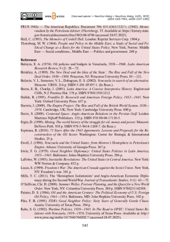 4. FRUS 1942c - The American Republics. Document 706. 831.6363/1321½ [Electronic resource] // Memorandum by the Petroleum Adviser (Thornburg). - September 23. - 1942. - Vol. VI. - Access mode : https://history.state.gov/historicaldocuments/frus1942v06/d706 (accessed 24.07.2025).
