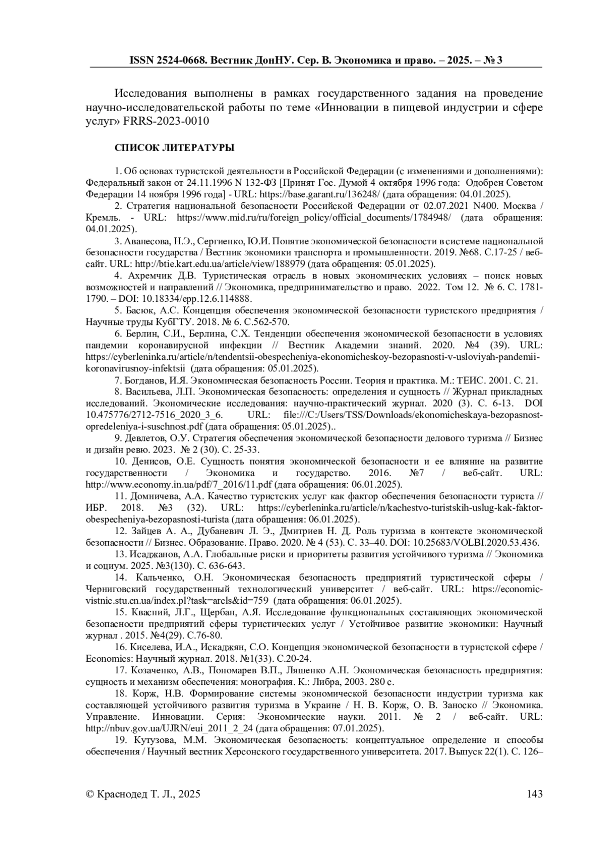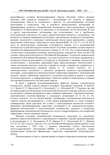 3. Аванесова, Н.Э., Сергиенко, Ю.И. Понятие экономической безопасности в системе национальной безопасности государства / Вестник экономики транспорта и промышленности. 2019. №68. С.17-25 / веб- сайт. URL: http://btie.kart.edu.ua/article/view/188979 (дата обращения: 05.01.2025).