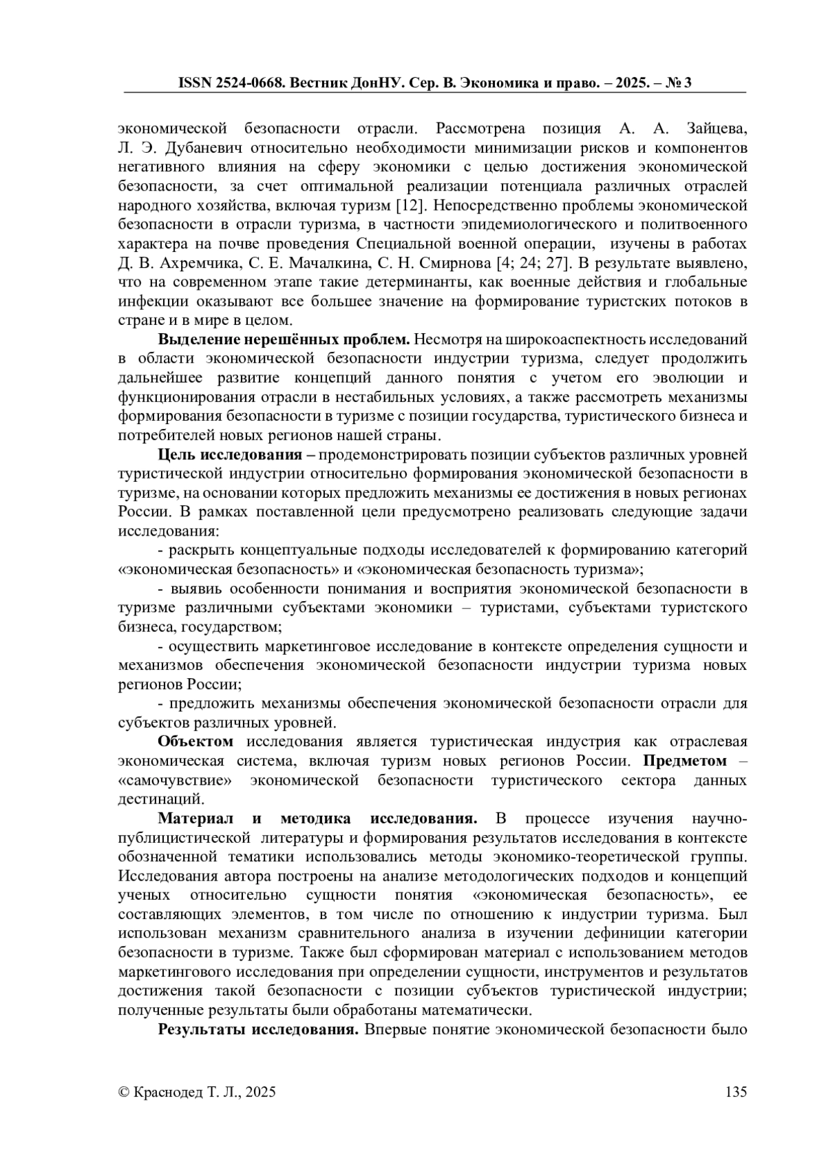12. Зайцев А. А., Дубаневич Л. Э., Дмитриев Н. Д. Роль туризма в контексте экономической безопасности // Бизнес. Образование. Право. 2020. № 4 (53). С. 33-40. DOI: 10.25683/VOLBI.2020.53.436 EDN: VNHHKO