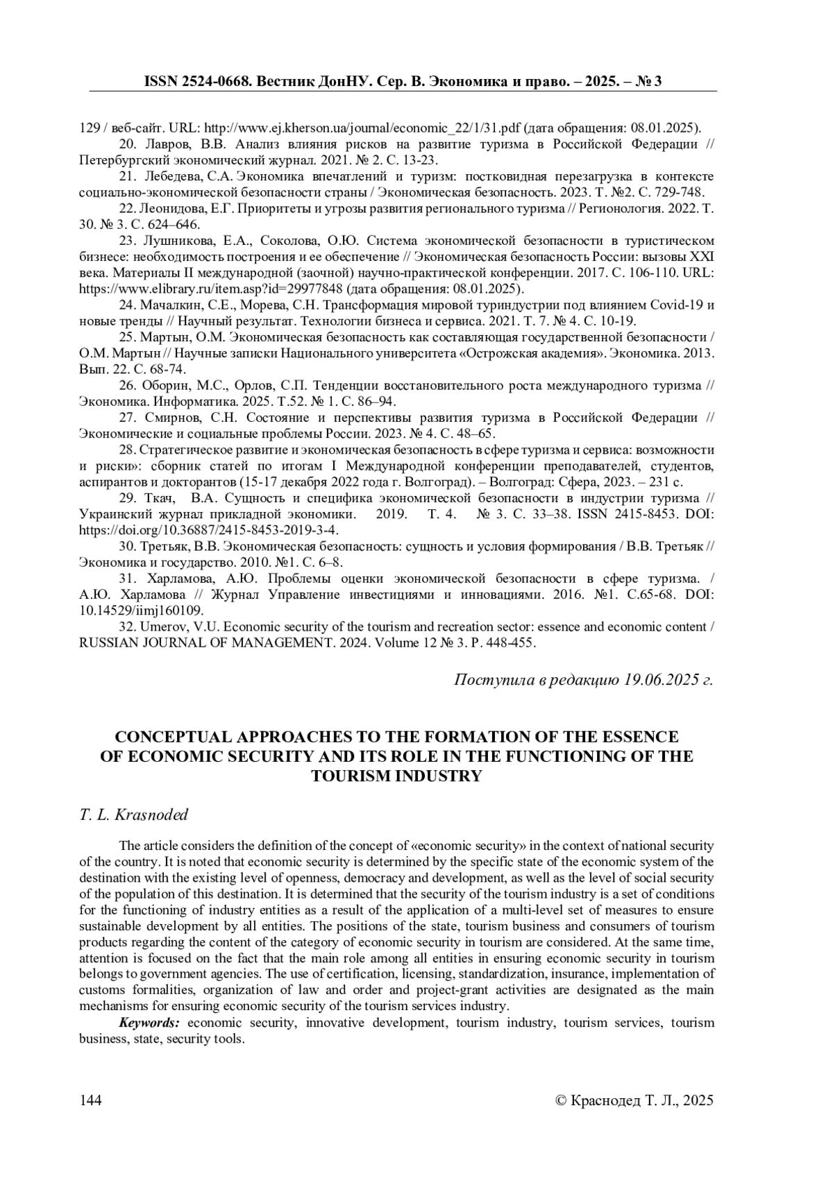 32. Umerov, V.U. Economic security of the tourism and recreation sector: essence and economic content / RUSSIAN JOURNAL OF MANAGEMENT. 2024. Volume 12 № 3. Р. 448-455. EDN: YLXWPI