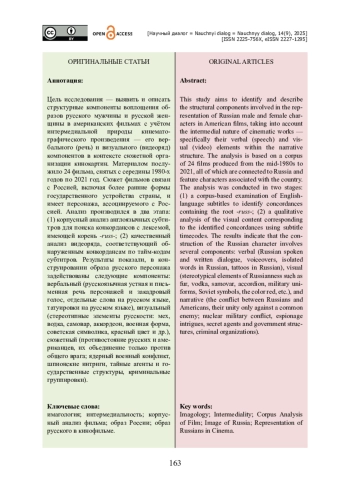 Цель исследования — выявить и описать структурные компоненты воплощения образов русского мужчины и русской женщины в американских фильмах с учётом интермедиальной природы кинематографического произведения — его вербального (речь) и визуального (видеоряд) компонентов в контексте сюжетной организации кинокартин. Материалом послужило 24 фильма, снятых с середины 1980-х годов по 2021 год. Сюжет фильмов связан с Россией, включая более ранние формы государственного устройства страны, и имеет персонажа, ассоциируемого с Россией. Анализ производился в два этапа: (1) корпусный анализ англоязычных субтитров для поиска конкордансов с лексемой, имеющей корень -russ-; (2) качественный анализ видеоряда, соответствующий обнаруженным конкордансам по тайм-кодам субтитров. Результаты показали, в конструировании образа русского персонажа задействованы следующие компоненты: вербальный (русскоязычная устная и письменная речь персонажей и закадровый голос, отдельные слова на русском языке, татуировки на русском языке), визуальный (стереотипные элементы русскости: мех, водка, самовар, аккордеон, военная форма, советская символика, красный цвет и др.), сюжетный (противостояние русских и американцев, их объединение только против общего врага; ядерный военный конфликт, шпионские интриги, тайные агенты и государственные структуры, криминальные группировки).