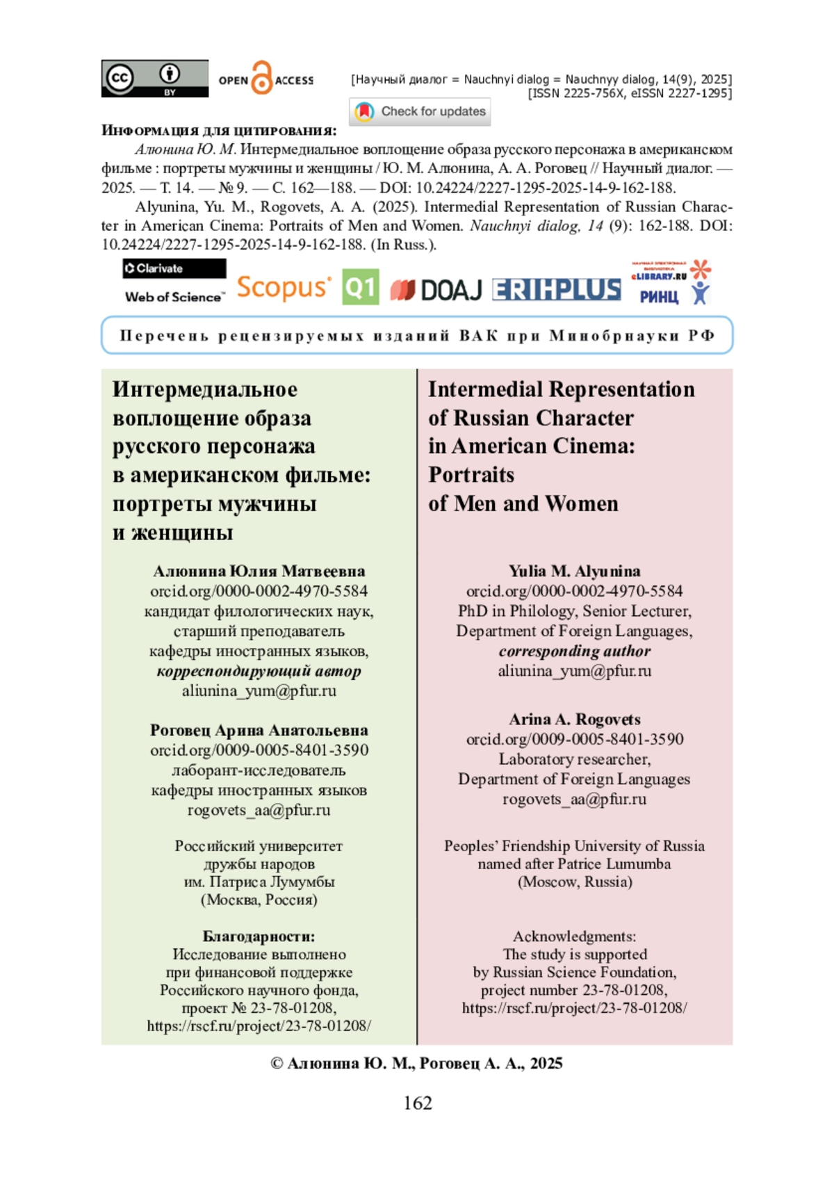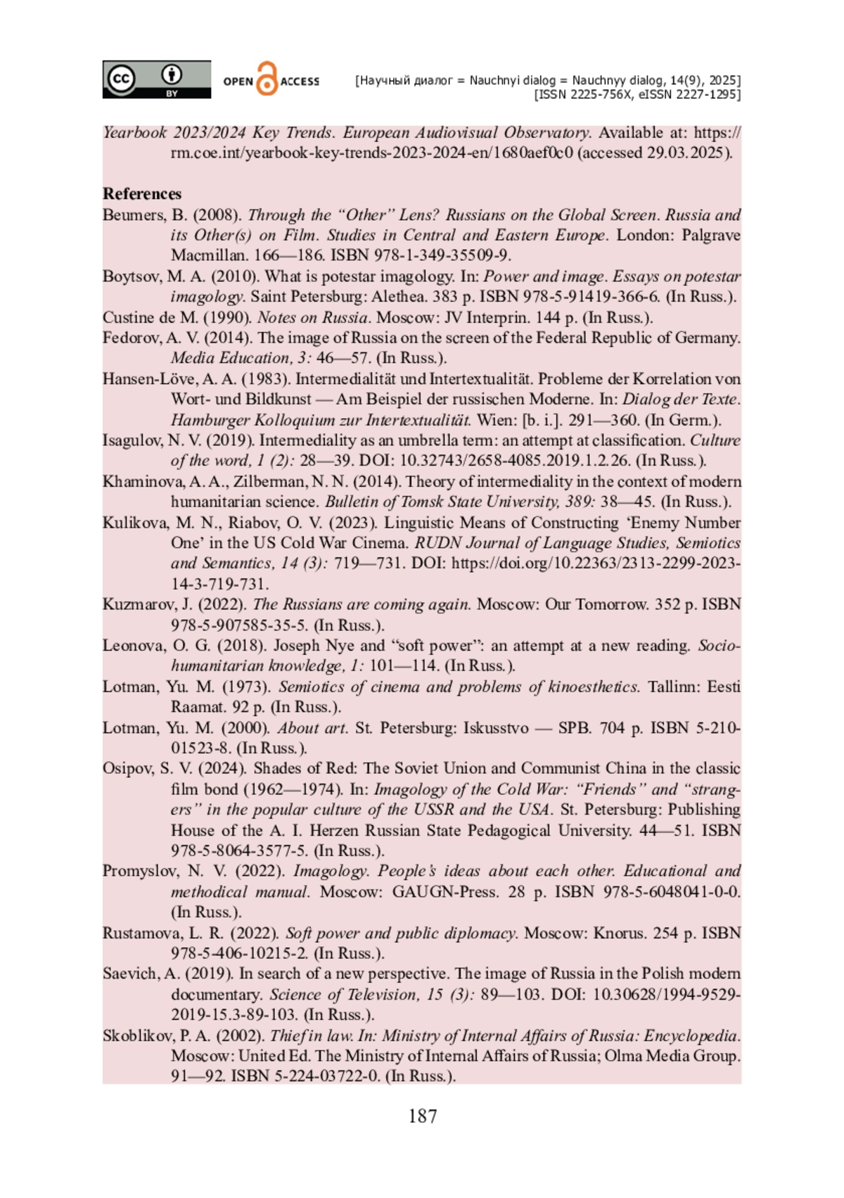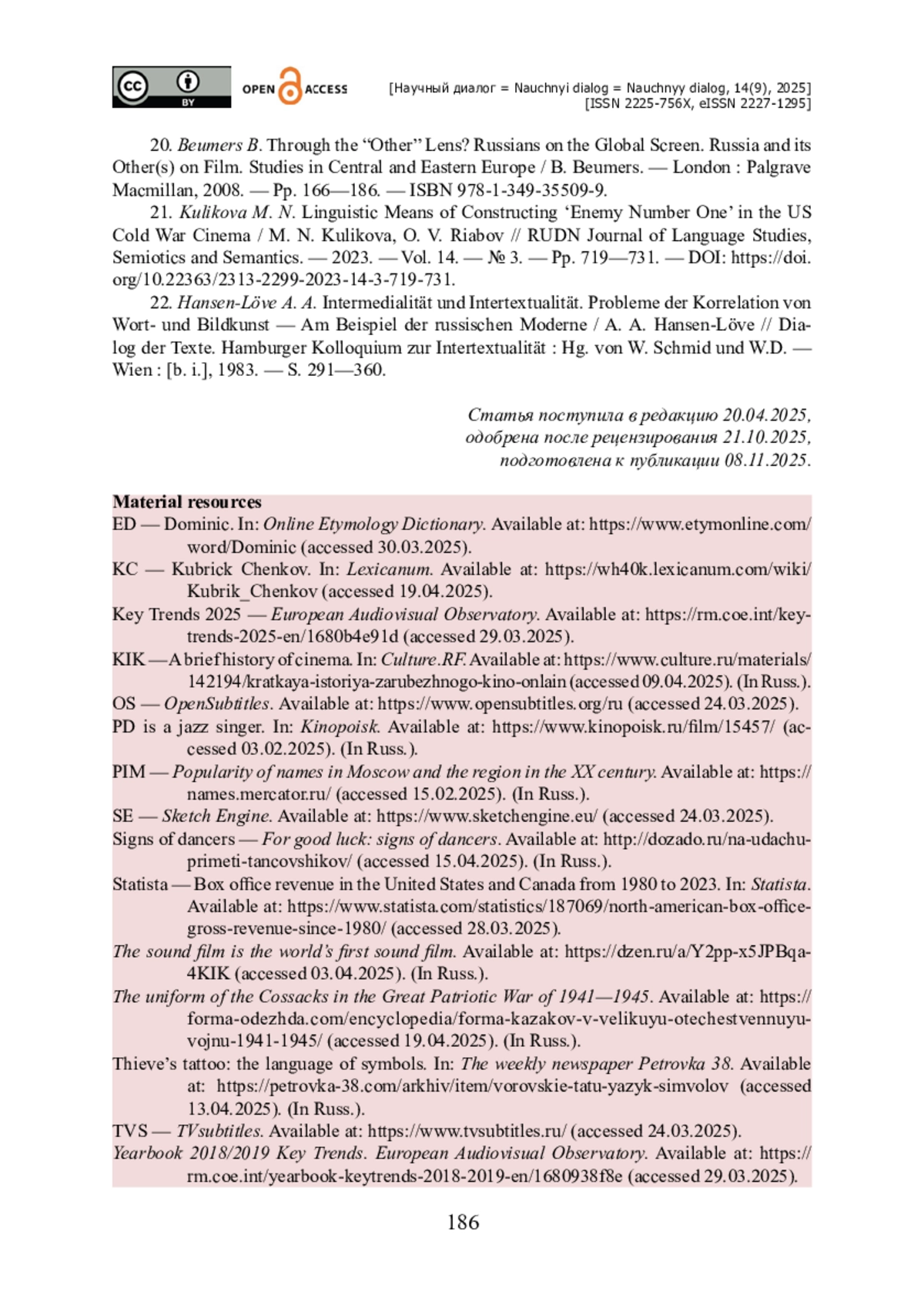 37. Kulikova M. N. Linguistic Means of Constructing ‘Enemy Number One’ in the US Cold War Cinema / M. N. Kulikova, O. V. Riabov // RUDN Journal of Language Studies, Semiotics and Semantics. - 2023. - Vol. 14. - № 3. - Pp. 719-731. - https://doi.org/10.22363/2313-2299-2023-14-3-719-731.