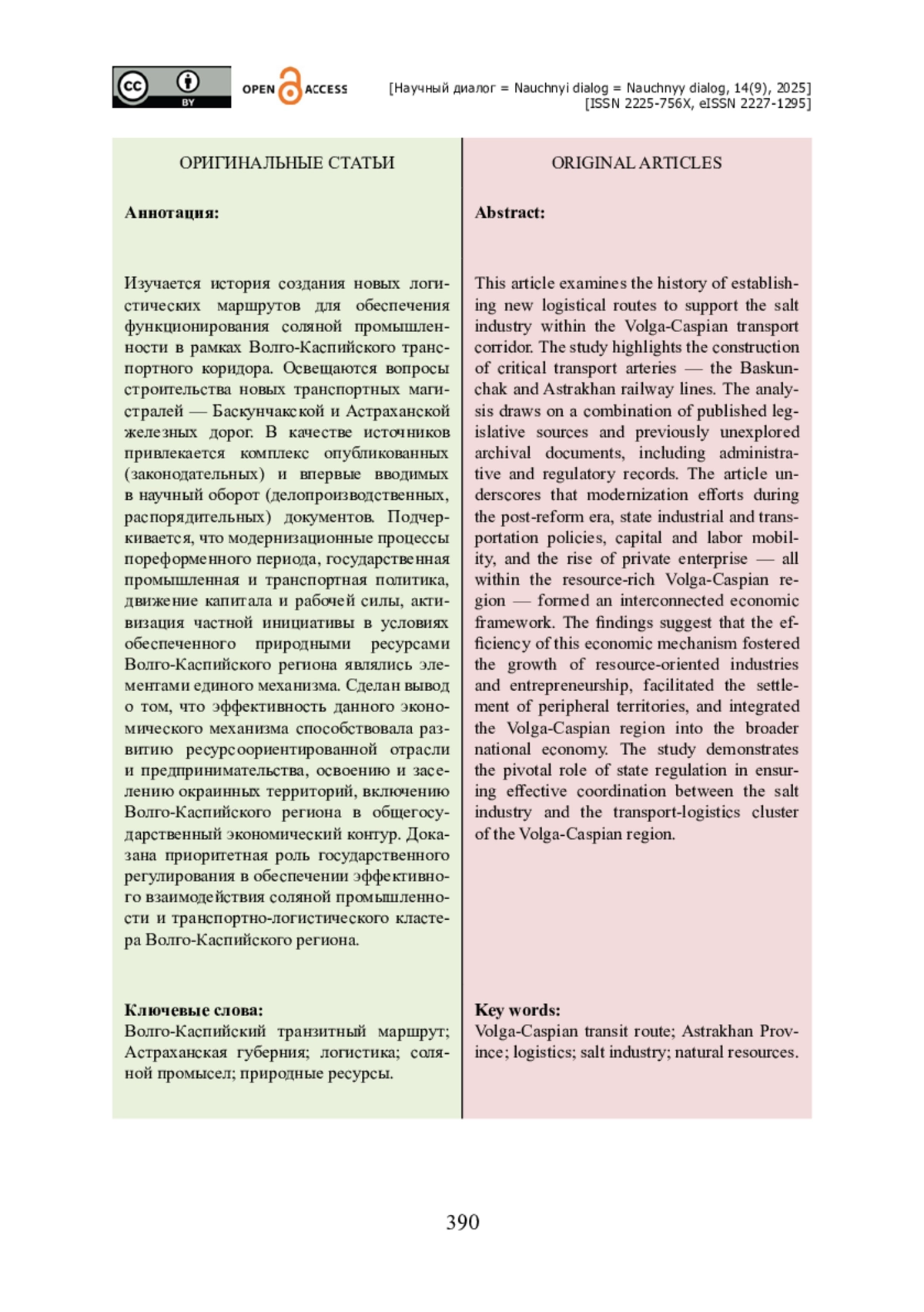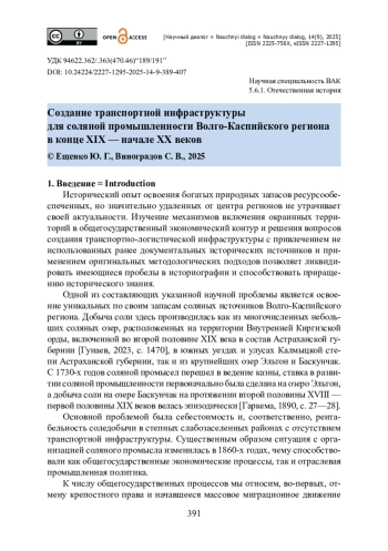 Изучается история создания новых логистических маршрутов для обеспечения функционирования соляной промышленности в рамках Волго-Каспийского транспортного коридора. Освещаются вопросы строительства новых транспортных магистралей — Баскунчакской и Астраханской железных дорог. В качестве источников привлекается комплекс опубликованных (законодательных) и впервые вводимых в научный оборот (делопроизводственных, распорядительных) документов. Подчеркивается, что модернизационные процессы пореформенного периода, государственная промышленная и транспортная политика, движение капитала и рабочей силы, активизация частной инициативы в условиях обеспеченного природными ресурсами Волго-Каспийского региона являлись элементами единого механизма. Сделан вывод о том, что эффективность данного экономического механизма способствовала развитию ресурсоориентированной отрасли и предпринимательства, освоению и заселению окраинных территорий, включению Волго-Каспийского региона в общегосударственный экономический контур. Доказана приоритетная роль государственного регулирования в обеспечении эффективного взаимодействия соляной промышленности и транспортно-логистического кластера Волго-Каспийского региона.