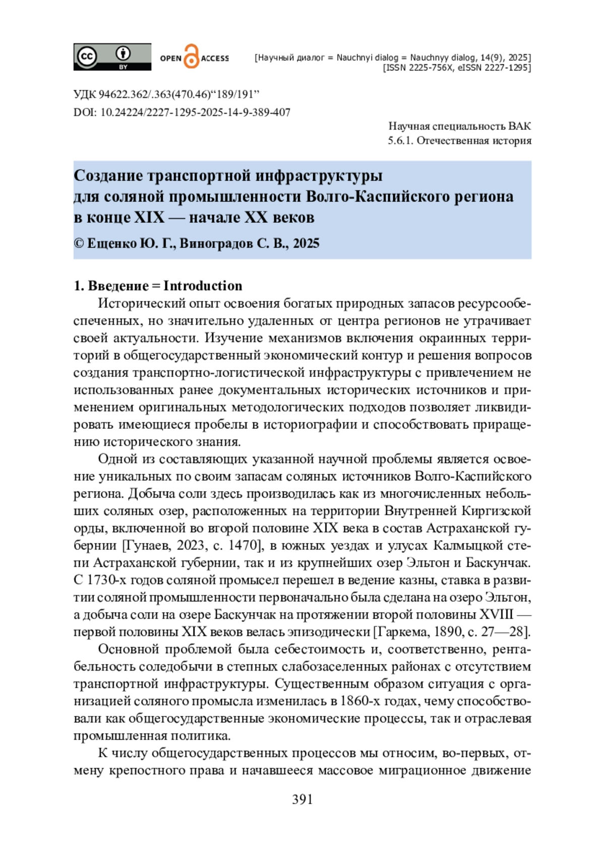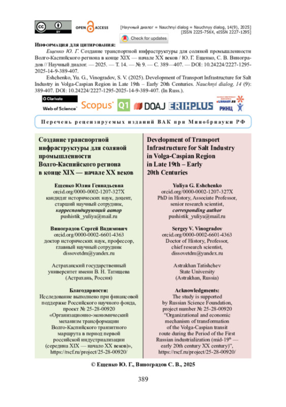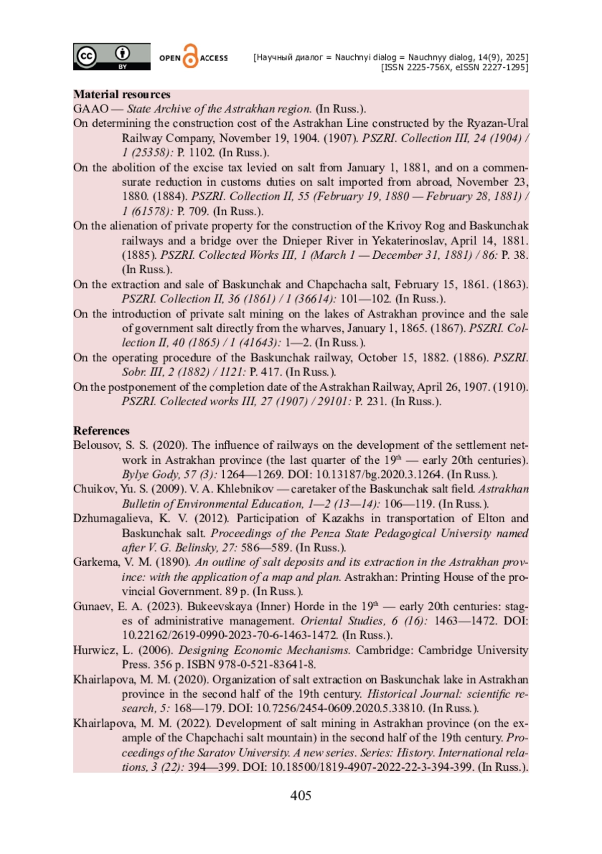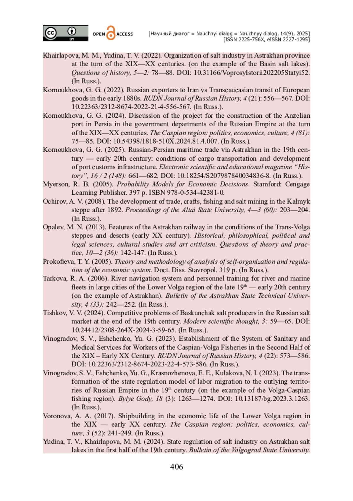 25. Хайрлапова М. М. Организация соляного дела в Астраханской губернии на рубеже XIX-XX вв. (на примере Басинских соляных озер) / М. М. Хайрлапова, Т. В. Юдина // Вопросы истории. - 2022. - № 5-2. - С. 78-88. - https://doi.org/10.31166/VoprosyIstorii202205Statyi52.
