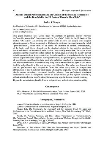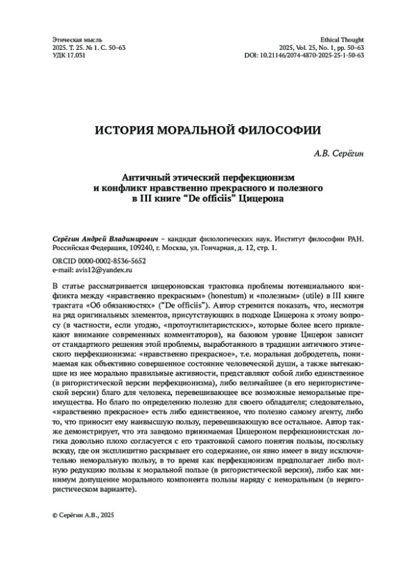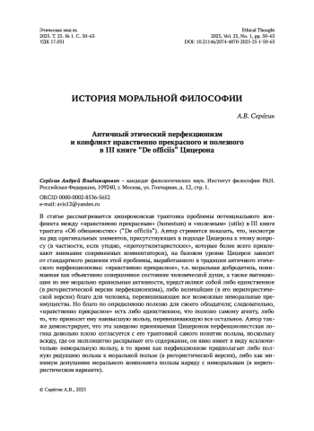 В статье рассматривается цицероновская трактовка проблемы потенциального конфликта между «нравственно прекрасным» (honestum) и «полезным» (utile) в III книге трактата «Об обязанностях» (“De officiis”). Автор стремится показать, что, несмотря на ряд оригинальных элементов, присутствующих в подходе Цицерона к этому вопросу (в частности, если угодно, «протоутилитаристских», которые более всего привлекают внимание современных комментаторов), на базовом уровне Цицерон зависит от стандартного решения этой проблемы, выработанного в традиции античного этического перфекционизма: «нравственно прекрасное», т. е. моральная добродетель, понимаемая как объективно совершенное состояние человеческой души, а также вытекающие из нее морально правильные активности, представляют собой либо единственное (в ригористической версии перфекционизма), либо величайшее (в его неригористической версии) благо для человека, перевешивающее все возможные неморальные преимущества. Но благо по определению полезно для своего обладателя; следовательно, «нравственно прекрасное» есть либо единственное, что полезно самому агенту, либо то, что приносит ему наивысшую пользу, перевешивающую все остальное. Автор также демонстрирует, что эта заведомо принимаемая Цицероном перфекционистская логика довольно плохо согласуется с его трактовкой самого понятия пользы, поскольку всюду, где он эксплицитно раскрывает его содержание, он явно имеет в виду исключительно неморальную пользу, в то время как перфекционизм предполагает либо полную редукцию пользы к моральной пользе (в ригористической версии), либо как минимум допущение морального компонента пользы наряду с неморальным (в неригористическом варианте).