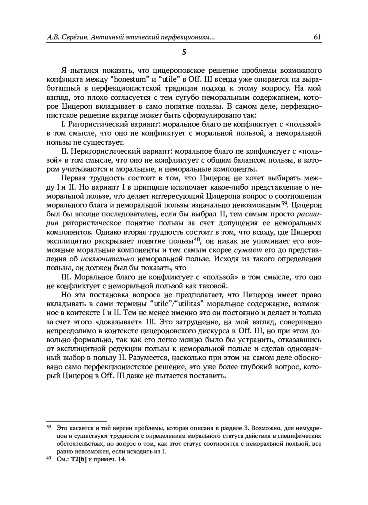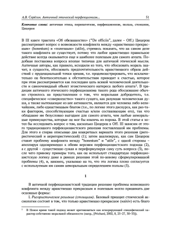 В III книге трактата «Об обязанностях» (“De officiis”, далее – Off.) Цицерон рассматривает вопрос о возможности конфликта между «нравственно прекрасным» (honestum) и «полезным» (utile), стремясь показать, что на самом деле такого конфликта не существует, потому что любое нравственно правильное действие всегда оказывается еще и наиболее полезным для самого агента. Подобная постановка вопроса вполне типична для античной этической мысли. Античные авторы, как правило, исходили из того, что обосновать мораль значит, в сущности, обосновать предпочтительность нравственного образа действий с пруденциальной точки зрения, т. е. продемонстрировать, что исключительно он безотносительно к обстоятельствам приводит к счастью, которое при этом рассматривается как последняя цель всякой человеческой деятельности и самоочевидный объект эгоистического интереса любого агента1.