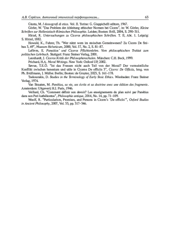 17. Veillard, Ch. “Comment définir son devoir? Les enseignements du plan suivi par Panétius dans son Peri kathêkontos”, Philosophie antique, 2014, No. 14, pp. 71-109.