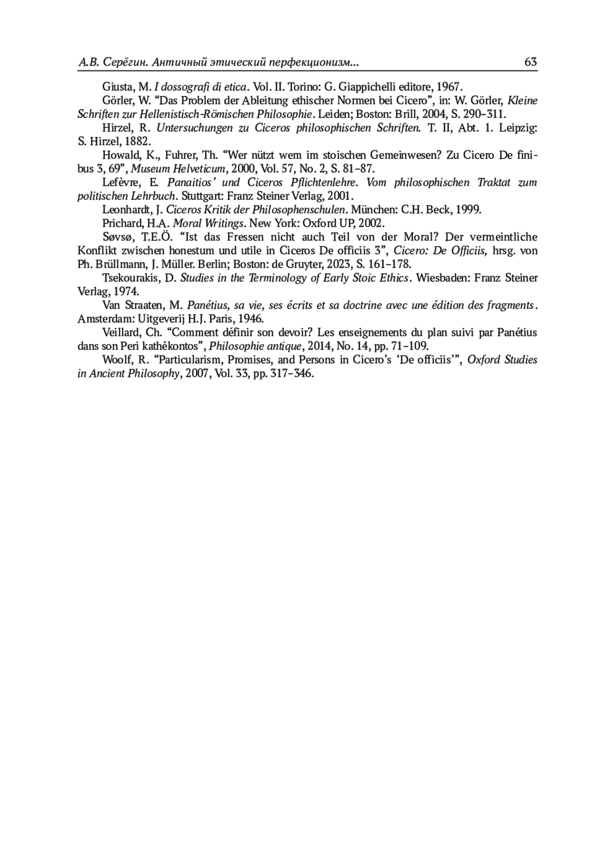 10. Howald, K., Fuhrer, Th. “Wer nützt wem im stoischen Gemeinwesen? Zu Cicero De finibus 3, 69”, Museum Helveticum, 2000, Vol. 57, No. 2, S. 81-87.