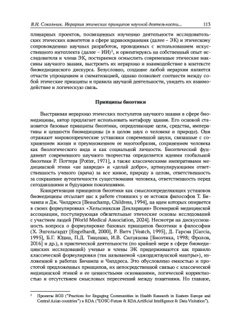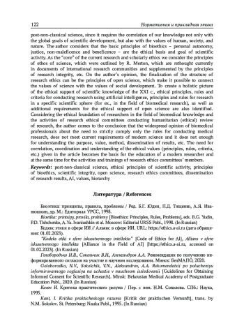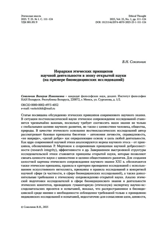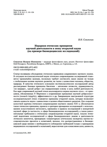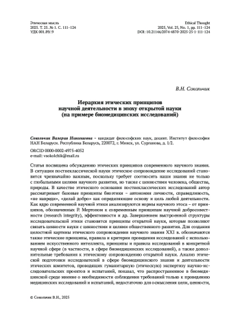 Статья посвящена обсуждению этических принципов современного научного знания. В ситуации постнеклассической науки этическое сопровождение исследований становится чрезвычайно важным, поскольку требует соотносить наши знания не только с глобальными целями научного развития, но также с ценностями человека, общества, природы. В качестве этического основания постнеклассических исследований автор рассматривает базовые принципы биоэтики – автономия личности, справедливость, «не навреди», «делай добро» как определяющие основу и цель любой деятельности. Как ядро современной научной этики анализируются нормы научного этоса – от принципов, обозначенных Р. Мертоном к современным принципам научной добросовестности (research integrity), эффективности и др. Завершением выстроенной структуры исследовательской этики становятся принципы открытой науки, которые позволяют связать ценности науки с ценностями и целями общественного развития. Для создания целостной картины этического сопровождения научного знания ХХI в. обозначаются также этические принципы, правила и критерии проведения исследований с использованием искусственного интеллекта, принципы и правила исследований в конкретной научной сфере (в частности, в сфере биомедицинских исследований), а также дополнительные требования к этическому сопровождению открытой науки. Анализ этической подготовки исследователей в сфере биомедицинского знания и деятельности этических комитетов, проводящих гуманитарную (этическую) экспертизу научно-исследовательских проектов и испытаний, показал, что распространенное в биомедицинской среде мнение о необходимости соблюдения требований только к проведению медицинских исследований и испытаний, недостаточно для осмысления цели, ценности, методов исследования, распространения его результатов. Необходимость корреляции, согласования и понимания приведенных в статье этических ценностей (принципов, правил, критериев и т. д.) становится основой как для воспитания современного исследователя, так и для деятельности членов исследовательских этических комитетов.