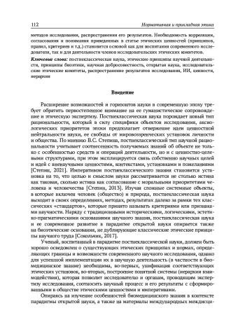 Расширение возможностей и горизонтов науки в современную эпоху требует обратить первостепенное внимание на ее гуманистическое сопровождение и этическую экспертизу. Постнеклассическая наука порождает новый тип рациональности, который в силу специфики объектов исследования, аксиологических приоритетов эпохи предполагает отвержение идеи ценностной нейтральности науки, ее свободы от мировоззренческих установок личности и общества. По мнению В. С. Степина, постнеклассический тип научной рациональности учитывает соотнесенность получаемых знаний об объекте не только с особенностью средств и операций деятельности, но и с ценностно-целевыми структурами, при этом эксплицируется связь собственно научных целей и идей с вненаучными ценностями, контекстами, установками и пожеланиями [Степин, 2021]. Императивом постнеклассического знания становится установка на то, что целью и смыслом науки рассматривается не столько истина как таковая, сколько истина как согласование с моральными приоритетами человека и человечества [Степин, 2013]. Изучая сложные системные объекты, в которые включен человек (общество) и природа, постнеклассическая наука выходит в своих определениях, методах, результатах далеко за рамки тех классических «стандартов», которые принято называть критериями или признаками научности. Наряду с традиционными историческими, логическими, эстетико-прагматическими основаниями научного знания, постнеклассическая наука и ее современное развитие в парадигме открытой науки опирается также на биоэтические основания, не дублирующие классические этические принципы научного труда [Сокольчик, 2017].