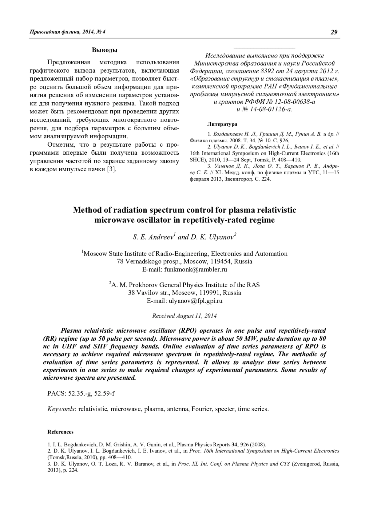 Андреев С. Е., Ульянов Д. К. Метод управления спектром плазменного релятивистского СВЧ-генератора в частотно-периодическом режиме 26