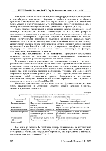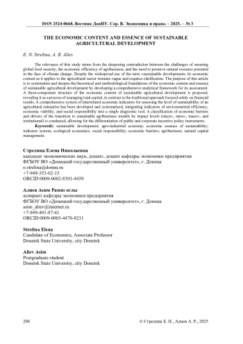 Актуальность исследования обусловлена углубляющимся противоречием между задачами обеспечения глобальной продовольственной безопасности, экономической эффективности агробизнеса и необходимостью сохранения природно-ресурсного потенциала в условиях климатических изменений. Несмотря на широкое использование термина «устойчивое развитие», его экономическое содержание применительно к аграрному сектору остаётся размытым и требует конкретизации. Целью статьи является систематизация и углубление теоретико-методологических основ экономического содержания и сущности устойчивого развития сельского хозяйства путём разработки комплексного аналитического аппарата для его оценки. Предложена авторская трёхкомпонентная структура экономического содержания устойчивого развития сельского хозяйства, раскрывающая его как процесс управления совокупным капиталом, в отличие от традиционного подхода, ориентированного лишь на финансовый результат. Разработана система взаимосвязанных экономических индикаторов для оценки уровня устойчивости сельскохозяйственного предприятия, интегрирующая показатели экологической эффективности, экономической жизнеспособности и социальной ответственности в единый диагностический инструмент. Проведена классификация экономических барьеров и драйверов перехода к устойчивым моделям агробизнеса по уровням воздействия (микро-, макро- и институциональный), что позволяет дифференцировать инструменты государственной и корпоративной политики стимулирования.