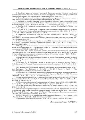 7. Алтухов А. И. Приоритетные направления пространственного развития сельского хозяйства России / А. И. Алтухов // Известия Кабардино-Балкарского научного центра РАН. - 2025. - Т. 27, № 3. - С. 143-153. -. DOI: 10.35330/1991-6639-2025-27-3-143-153 EDN: UTULFK