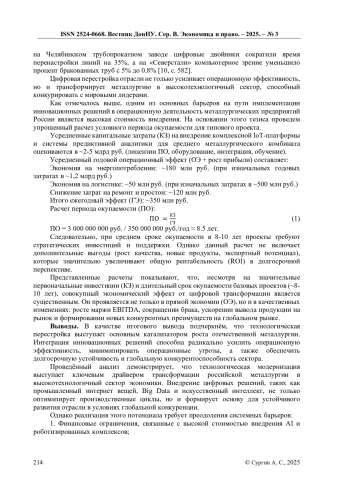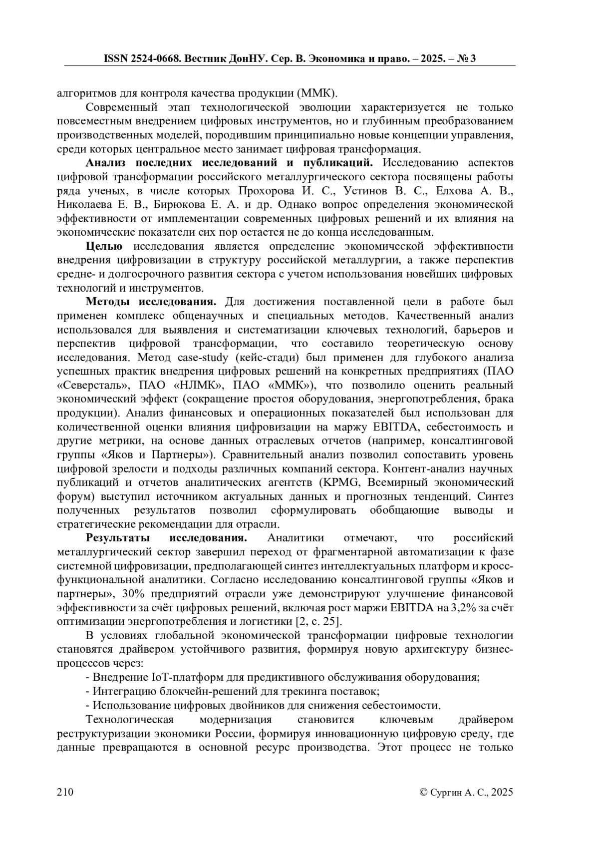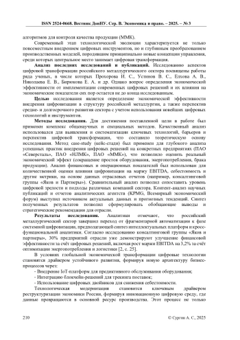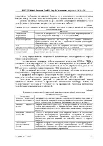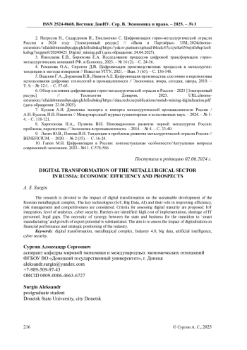 Исследование посвящено влиянию цифровой трансформации на устойчивое развитие металлургического комплекса России. Рассмотрены ключевые технологии (IoT, Big Data, ИИ) и их роль в повышении эффективности, управлении рисками и конкурентоспособности. Предложены критерии оценки цифровой зрелости: интеграция IoT, уровень аналитики, кибербезопасность. Выявлены барьеры: высокая стоимость внедрения, дефицит IT-кадров, правовые пробелы. Обоснована необходимость синергии государства и бизнеса для перехода к «умному производству» и роста экспортного потенциала. Цель - оценка влияния цифровизации на финансовые показатели и стратегическое позиционирование отрасли.