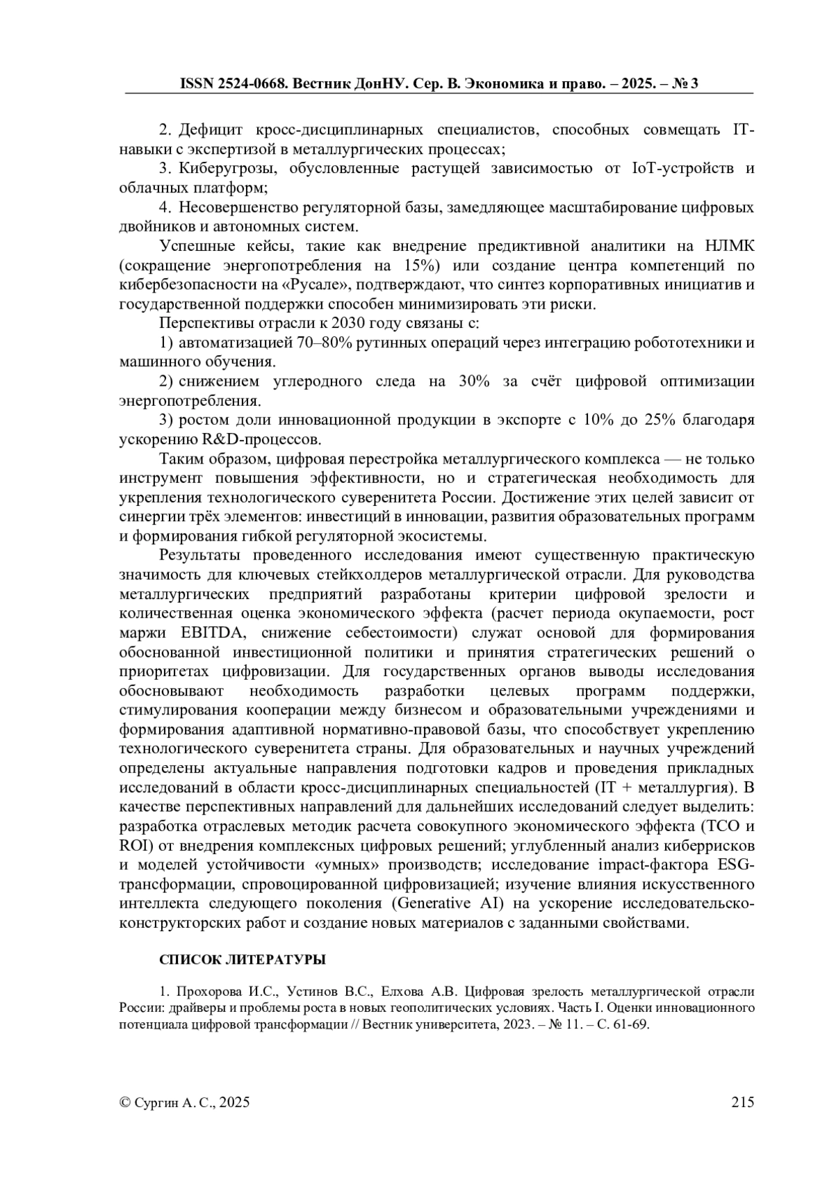 1. Прохорова И.С., Устинов В.С., Елхова А.В. Цифровая зрелость металлургической отрасли России: драйверы и проблемы роста в новых геополитических условиях. Часть I. Оценки инновационного потенциала цифровой трансформации // Вестник университета, 2023. - № 11. - С. 61-69.