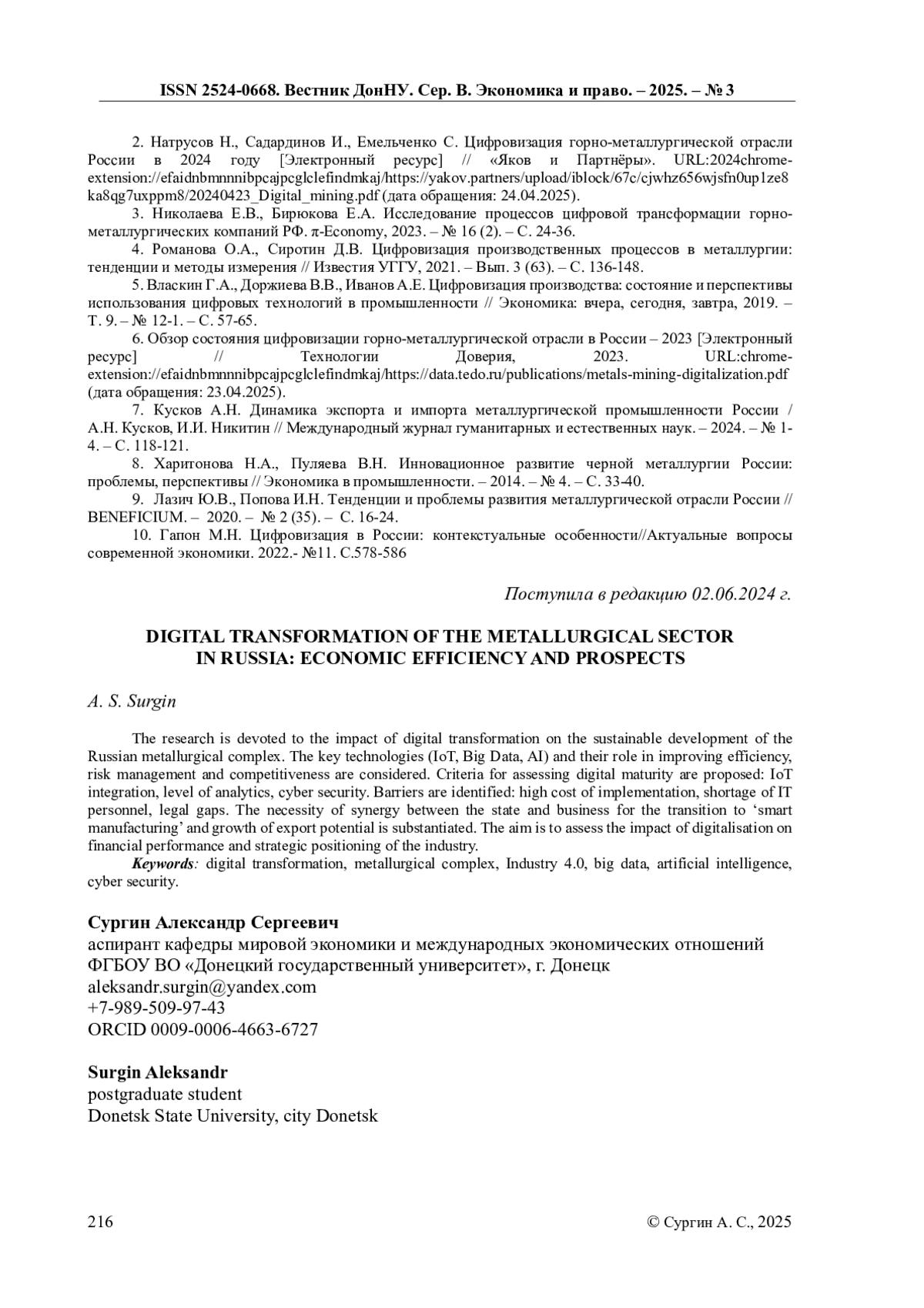 2. Натрусов Н., Садардинов И., Емельченко С. Цифровизация горно-металлургической отрасли России в 2024 году [Электронный ресурс] // “Яков и Партнёры”. URL:2024chrome- extension://efaidnbmnnnibpcajpcglclefindmkaj/https://yakov.partners/upload/iblock/67c/cjwhz656wjsfn0up1ze8ka8qg7uxppm8/20240423_Digital_mining.pdf (дата обращения: 24.04.2025).
