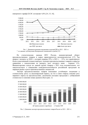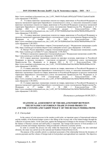 В условиях кризисных процессов в современном мировом порядке, важным аспектом международных отношений и стабильности бюджетной системы России является наполнение доходной части федерального бюджета за счёт взыскания таможенных платежей. Вместе с этим, на фоне изменения структуры внешней торговли важным является баланс таможенно-тарифной политики России. Определённое экономическое и стратегическое значение имеет внешнеторговой оборот продовольственных товаров, являясь индикатором экономической активности России. С целью рассмотрения процесса не только в рамках большой системы, но и отдельных элементов, исследование осуществлялось на уровне страны и Южного федерального округа. Целью научной статья является статистическая оценка взаимосвязи динамики таможенных платежей с объёмами внешней торговли продовольственными товарами и сельскохозяйственного сырья. К задачам статьи следует отнести анализ изменения объёмов таможенных платежей и объёмов экспорта и импорта продовольственных товаров, оценка развития внешней торговли и корреляции между таможенными платежами и рассматриваемых товарных потоков. По итогам исследования установлено наличие существенной взаимосвязи видов таможенных платежей, администрируемых таможенными органами России с показателями внешнеторговых товаропотоков продовольственных товаров.
