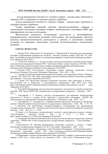 2. Гомон И. В., Фоменко А. А. Анализ состава и структуры таможенных платежей, перечисляемых в доходную часть федерального бюджета РФ // Экономика и бизнес: теория и практика. 2019. №4-1. URL: https://cyberleninka.ru/article/n/analiz-sostava-i-struktury-tamozhennyh-platezhey-perechislyaemyh-v-dohodnuyu-chast-federalnogo-byudzheta-rf (дата обращения: 06.03.2025). EDN: NHLOAG