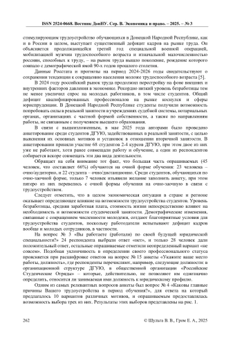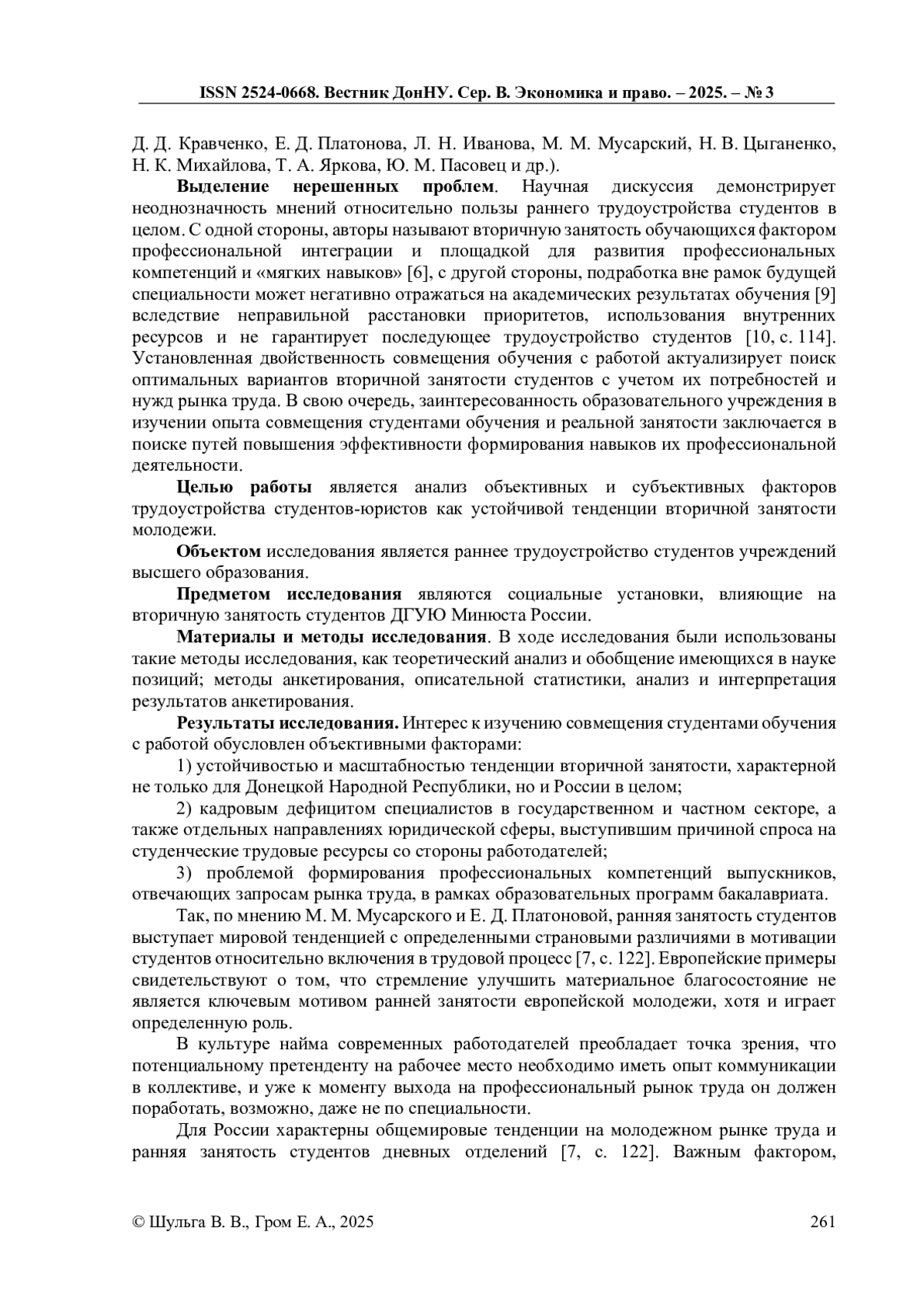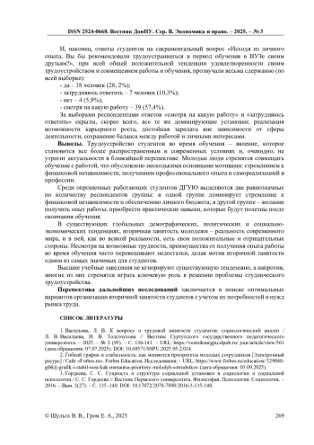 1. Васильева, Л. В. К вопросу о трудовой занятости студентов: социологический анализ / Л. В. Васильева, И. В. Толстоухова // Вестник Сургутского государственного педагогического университета. - 2025. - № 2 (95). - С. 136-141. - URL: https://vestniksurgpu.elpub.ru/jour/article/view/561 (дата обращения: 07.07.2025). DOI: 10.69571/SSPU.2025.95.2.014 EDN: EKXCGQ