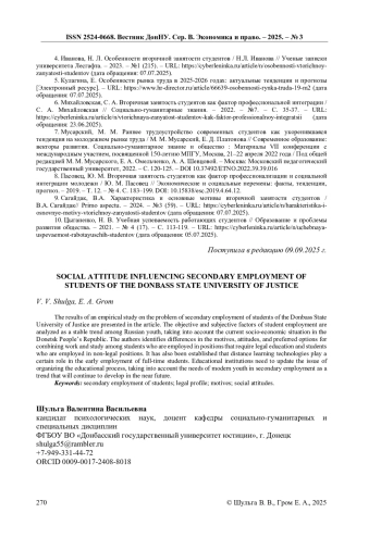 В статье представлены результаты эмпирического исследования по проблеме вторичной занятости студентов ДГУЮ Минюста России. Проанализированы объективные и субъективные факторы трудоустройства обучающихся как устойчивые тенденции в молодежной среде России с учетом сложившейся социально-экономической обстановки в Донецкой Народной Республике. Выявлены различия в мотивах, аттитюдах и предпочтительных вариантах совмещения работы с обучением студентов, трудоустраивающихся на должности, требующие получения юридического образования, и студентов, работающих не по специальности. Установлено, что определенную роль в ранней занятости студентов дневной формы обучения играют дистанционные образовательные технологии. Образовательным учреждениям необходимо актуализировать вопрос организации учебно-воспитательного процесса с учетом потребностей молодежи во вторичной занятости как тенденции, которая продолжит развитие в перспективе.