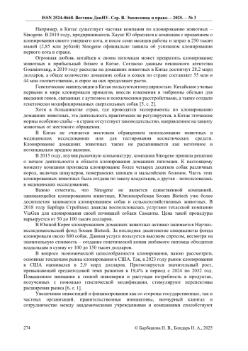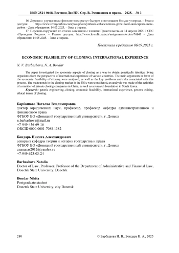 В работе исследованы экономические аспекты клонирования как способа получения генетически идентичных живых организмов с позиции международного опыта различных стран. Осуществлен анализ основных аргументов в пользу экономической целесообразности клонирования, а также имеющие место ключевые проблемы и риски, связанные с данным процессом. Рассмотрены основные тенденции рынка клонирования в США, проведён анализ деятельности ряда частных компаний по клонированию в Китае, а также научно-исследовательского фонда в Южной Корее.