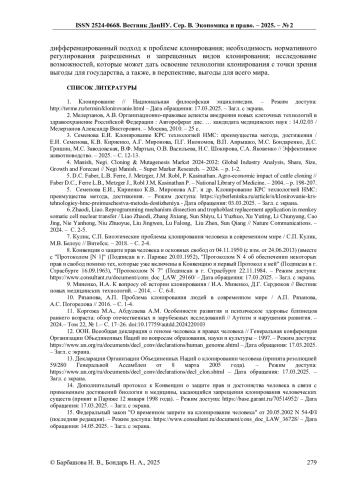 15. Федеральный закон “О временном запрете на клонирование человека” от 20.05.2002 N 54-ФЗ (последняя редакция). - Режим доступа: https://www.consultant.ru/document/cons_doc_LAW_36728/- Дата обращения: 14.05.2025. - Загл. с экрана.