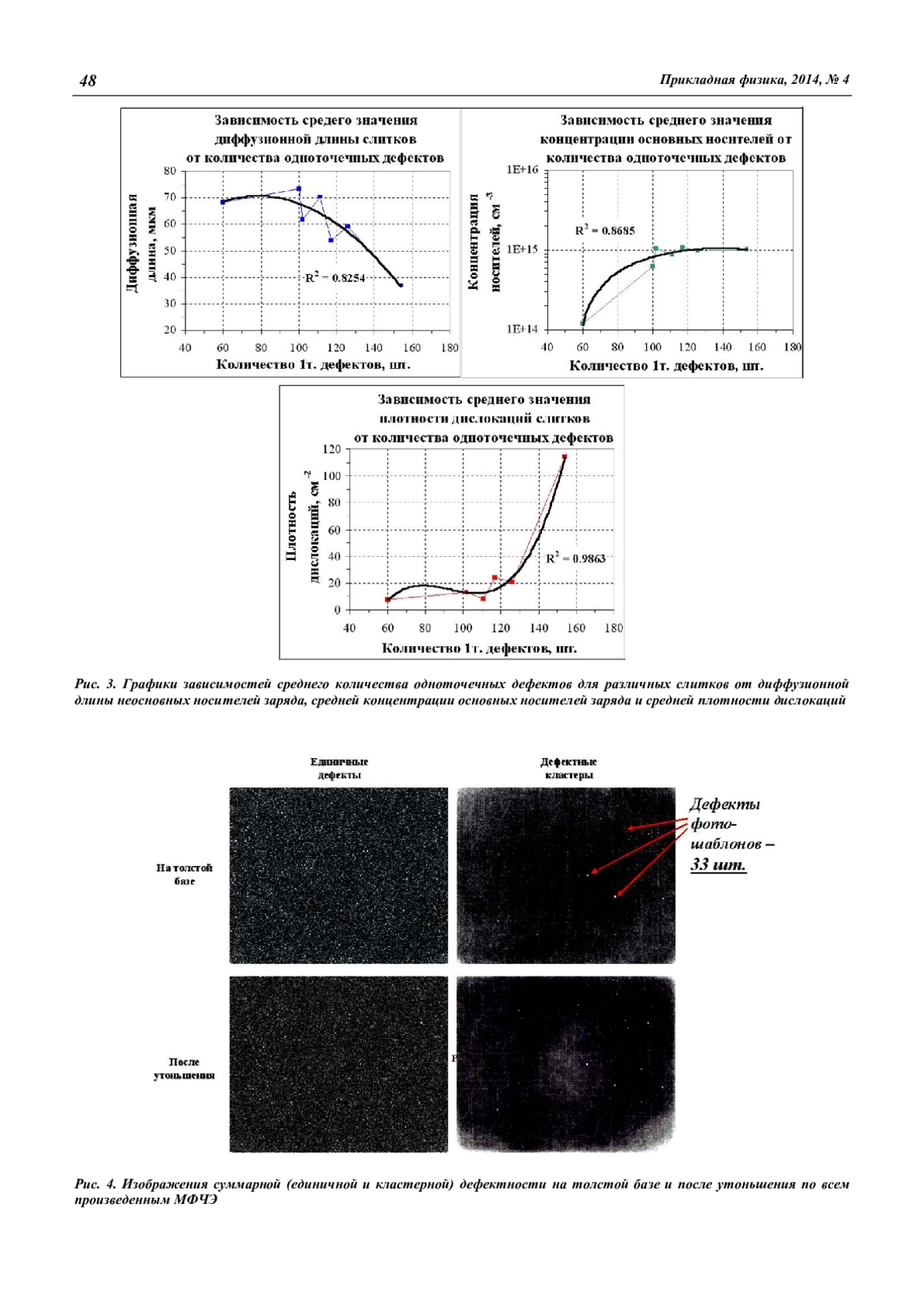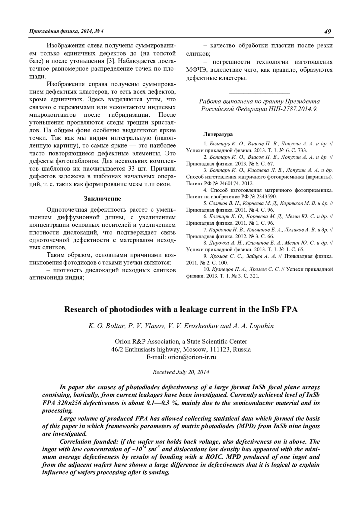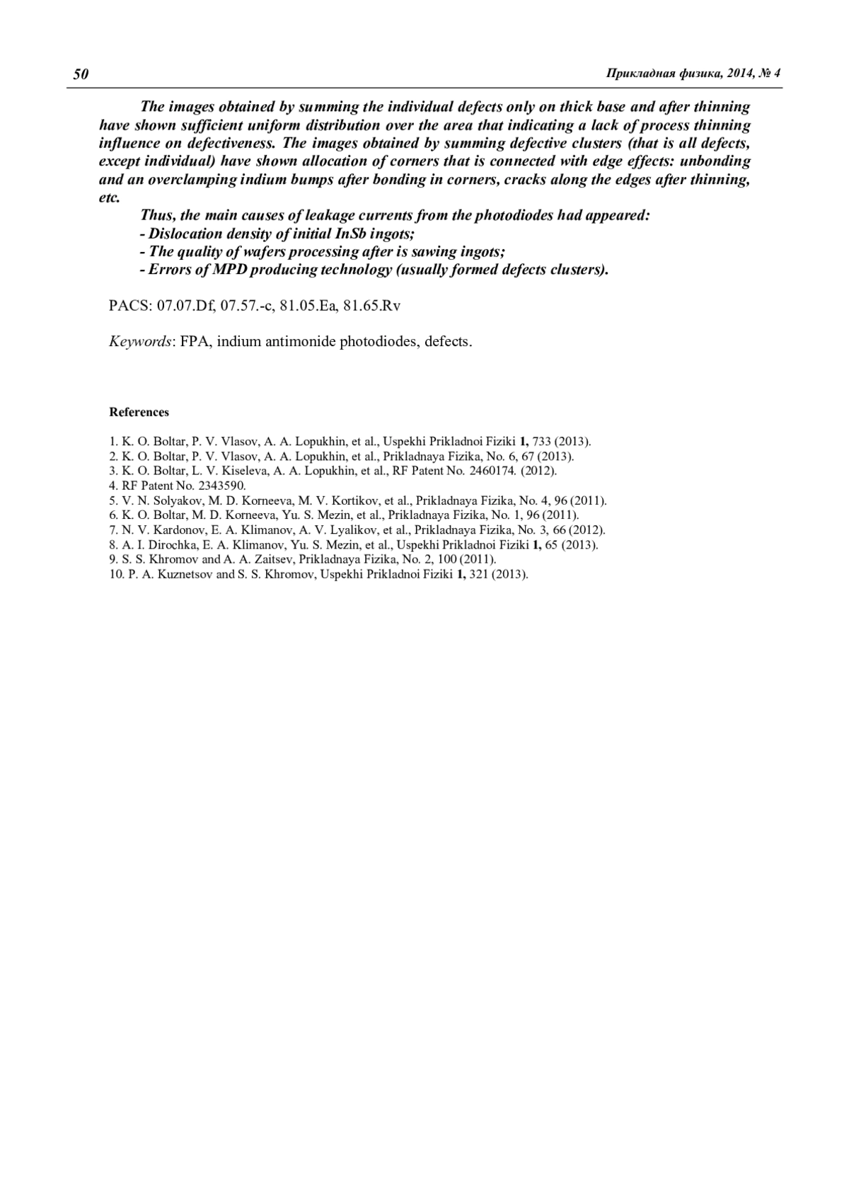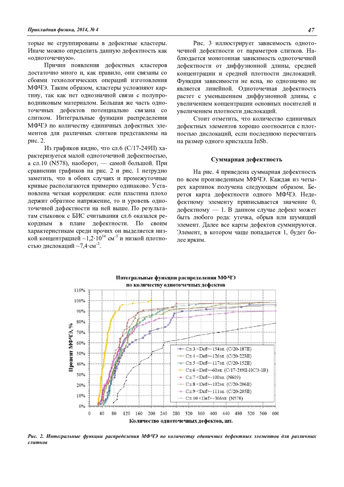 Проведено исследование основных причин возникновения фотодиодов с токами утечки в МФПУ на основе антимонида индия. На большом объеме МФЧЭ установлена связь одноточечной дефектности с напряжением пробоя, диффузионной длиной, концентрацией основных носителей и плотностью дислокаций. Представлены характерные распределения дефектности по пластинам антимонида индия. Показано влияние на дефектность качества обработки пластин после резки слитков и погрешностей технологии изготовления.