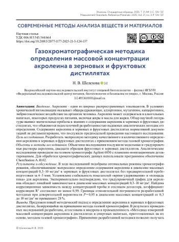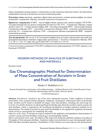 Цель исследования. Разработать экспрессную методику качественного и количественного определения акролеина в зерновых и фруктовых дистиллятах с применением метода газовой хроматографии.
