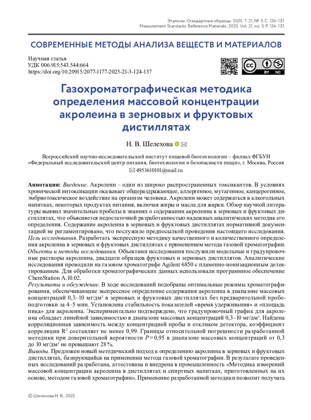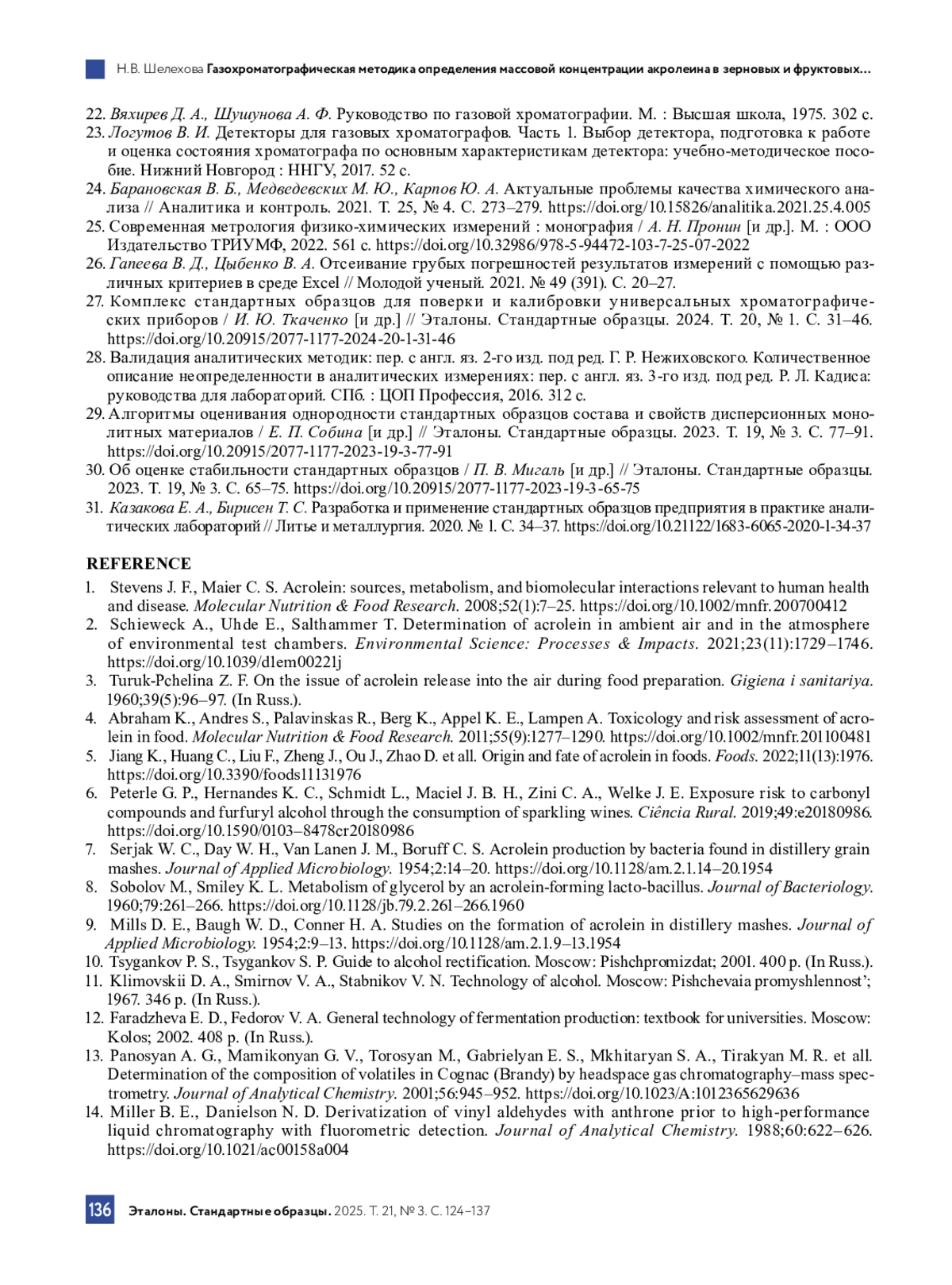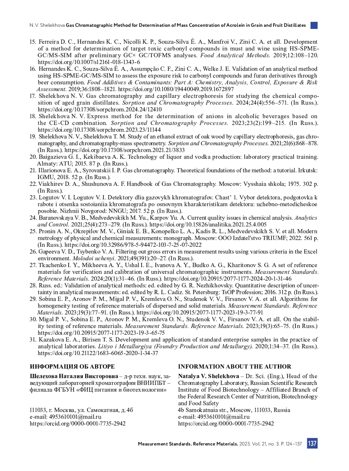 17. Шелехова Н. В. Методы газовой хроматографии и капиллярного электрофореза для исследования химического состава выдержанных зерновых дистиллятов // Сорбционные и хроматографические процессы. 2024. Т. 24, № 4. С. 556-571. DOI: 10.17308/sorpchrom.2024.24/12410