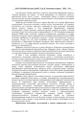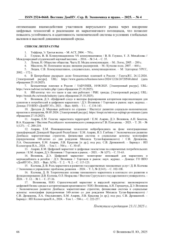9. Возиянов, Д.Э. “Цифровой след” и векторы формирования алгоритмов персонализации для клиентов и потребителей в цифровом маркетинге / Д.Э. Возиянов // Торговля и рынок: науч. журнал. - Донецк: ГО ВПО “ДонНУЭТ”, 2021. - Вып. 4(60). - Т.1. - С.134-143.