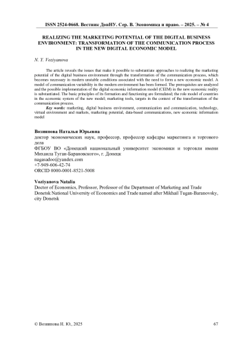 В статье раскрыты вопросы, позволяющие обосновать подходы к реализации маркетингового потенциала цифровой бизнес-среды через трансформацию коммуникационного процесса, что становится необходимым в современных нестабильных условиях, связанных с необходимостью формирования новой экономической модели. Сформирована модель вариативности коммуникации в современной среде. Проанализированы предпосылки и обоснована возможная для реализации в новой экономической реальности цифровая экономическая информационная модель (ЦЭИМ). Сформулированы основные принципы ее формирования и функционирования; ролевая модель стран в экономической системе новой модели; инструментарий маркетинга, целевые ориентиры в условиях трансформации коммуникационного процесса.