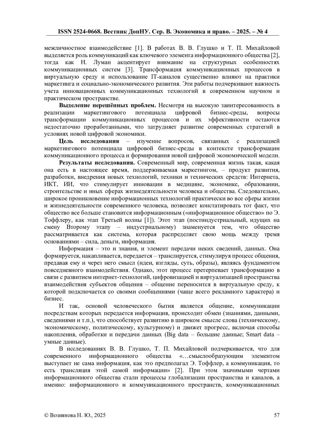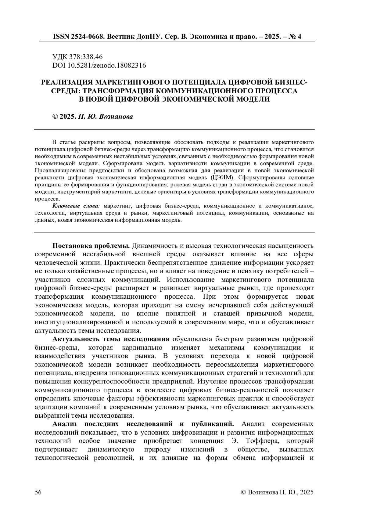 17. Возиянова, Н.Ю. Стратегический маркетинг в вирусной парадигме: закономерности цифровой бизнес-среды и алгоритмизация креативности / Н.Ю. Возиянова, А.Н. Германчук, Д.Э. Возиянов / Экономическое развитие Донбасса: маркетинговые стратегии, финансовая система и социальные аспекты: монография (приуроченная 160-летию со дня рождения Михаила Туган-Барановского) / С.В. Дрожжина, Л.А. Омельянович, Е.М. Азарян, Л.В. Крылова [и др.]; под ред. С.В. Дрожжиной. - Барнаул: ИП Колмогоров И.А., 2024. - Том 1. - 504 с. - С. 222-257.