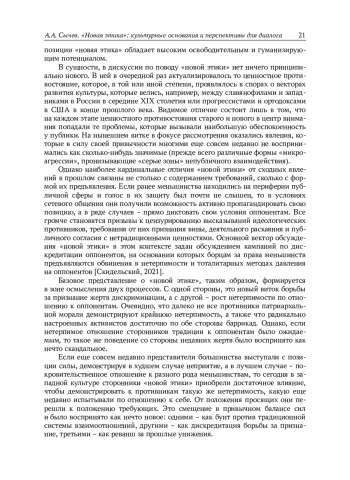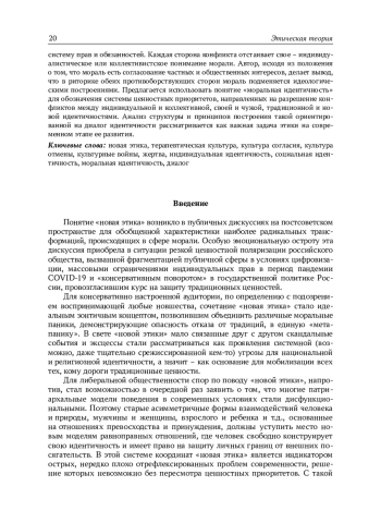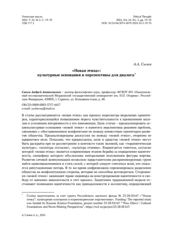 В статье рассматривается «новая этика» как процесс пересмотра моральных ориентиров, характеризующийся повышением порога чувствительности к проявлениям насилия и усилением нетерпимости к его виновникам. Цель статьи – проанализировать социокультурные основания «новой этики» и наметить перспективы решения проблем, связанных с обостряющимися конфликтами по поводу ценностных ориентиров развития общества. Проанализированы дискуссии по поводу «новой этики», очерчено ее предметное поле. Показано, что предпосылки, цели и средства «новой этики» могут быть раскрыты при ее рассмотрении в контексте таких явлений, как «терапевтическая культура», «культура согласия», «культура отмены». Выдвигается гипотеза, согласно которой «новая этика» является современным этапом борьбы за определение идентичности, специфика которого обусловлена центральным положением фигуры жертвы. Развитие сетевой коммуникации позволило представителям дискриминируемых групп найти единомышленников и стать силой, с которой следует считаться всем, кто опасается репутационных потерь. В то же время цифровизация спровоцировала разделение общества на конфликтующие стороны, которые не способны договориться. Сторонники «новой этики» защищают право индивида на конструирование идентичности и свободу от внешних вмешательств в этот процесс. Защитники традиционной морали отстаивают понимание идентичности как принадлежности к коллективу, определяющей систему прав и обязанностей. Каждая сторона конфликта отстаивает свое – индивидуалистическое или коллективистское понимание морали. Автор, исходя из положения о том, что мораль есть согласование частных и общественных интересов, делает вывод, что в риторике обеих противоборствующих сторон мораль подменяется идеологическими построениями. Предлагается использовать понятие «моральная идентичность» для обозначения системы ценностных приоритетов, направленных на разрешение конфликтов между индивидуальной и коллективной, своей и чужой, традиционной и новой идентичностями. Анализ структуры и принципов построения такой ориентированной на диалог идентичности рассматривается как важная задача этики на современном этапе ее развития.