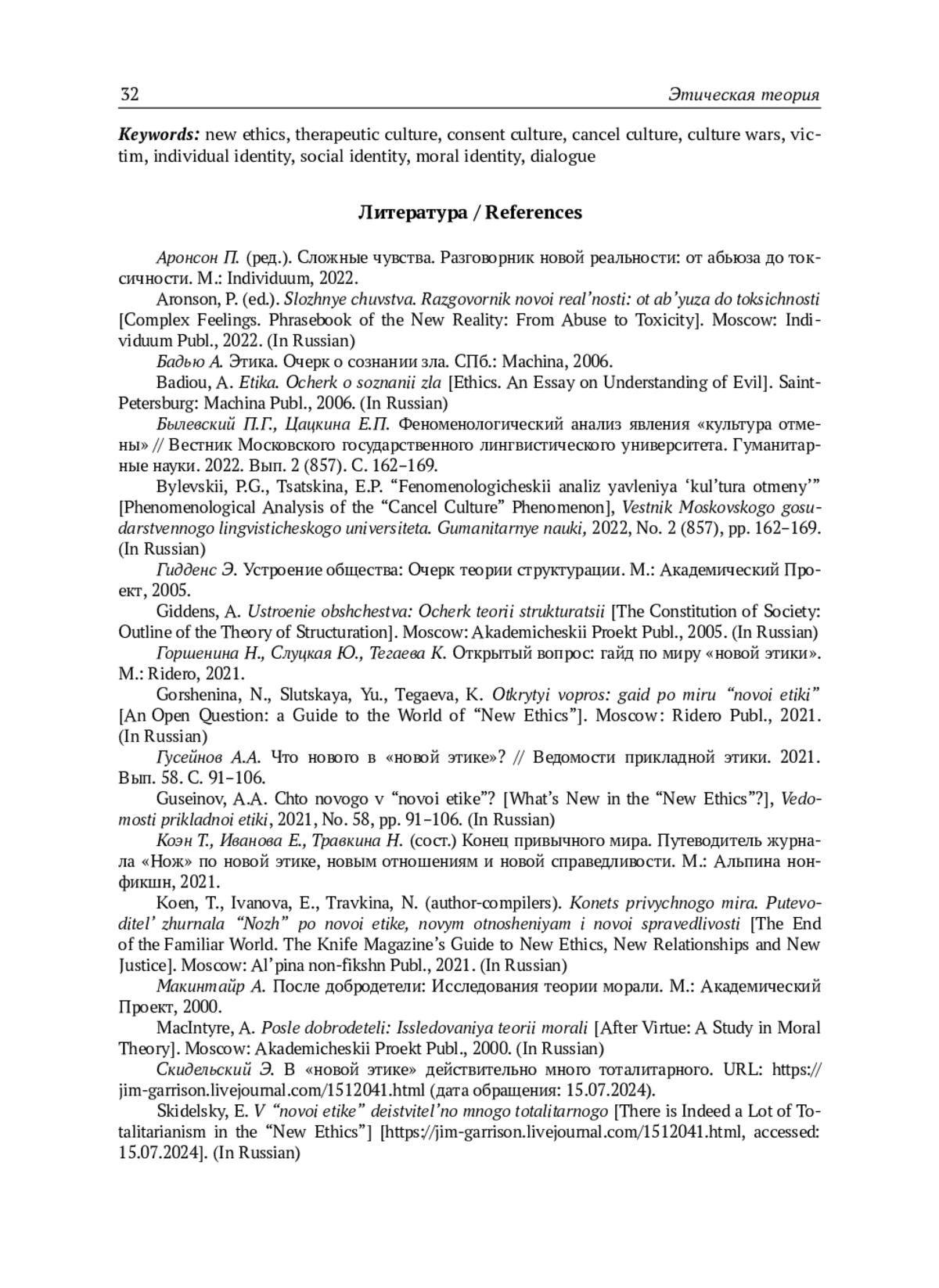 12. Guseinov, A.A. Chto novogo v “novoi etike”? [What’s New in the “New Ethics”?], Vedomosti prikladnoi etiki, 2021, No. 58, pp. 91-106. (In Russian).
