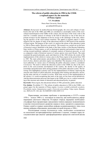 Актуальность и цели. В современной отечественной историографии кризис и распад государственности на рубеже 1980-1990-х гг. рассматриваются как катастрофические результаты социокультурной трансформации СССР. В этом контексте актуальность работы обусловлена необходимостью научного анализа реформ в сфере образования как одного из важнейших ресурсов адаптации советского общества к вызовам времени, отражавшего при этом специфику социокультурного перехода. Обращение к региональным аспектам определяется низкой степенью изученности образовательной реформы 1984 г. на материалах Пензенской области. Целью данной работы является анализ реформы системы образования 1984 г. в Пензенской области. Материалы и методы. Исследование выполнено на основе исторических источников, выявленных в фондах Государственного архива Российской Федерации, Государственного архива Пензенской области, а также идеологических материалов и нормативно-правовых актов. При решении исследовательских задач применялись методы системного анализа исторических процессов, а также компаративного изучения исторических источников различной видовой принадлежности. Результаты. В ходе исследования были рассмотрены общие принципы, цели и задачи реформы 1984 г., результаты реализации этой реформы по различным направлениям в Пензенской области в период с 1984 по 1987 г. Выявлены основные достижения и проблемы при реализации мероприятий на уровне городов, районов и всей области. Рассмотрена динамика деятельности местных органов власти по различным направлениям реформирования системы народного образования. Выводы. Необходимость реформирования системы образования в СССР была обусловлена замедлением социально-экономического развития страны, падением качества знаний и профессиональных навыков у выпускников системы народного образования. В качестве приоритетных задач реализации реформ были выделены: совершенствование структуры и содержания школьного образования, развитие трудового обучения и воспитания, повышение статуса и роли педагога в обществе. При определенных успехах в реализации реформы стоит признать, что ни одна из поставленных задач не была решена окончательно. А начавшиеся в СССР процессы демократизации вызвали к жизни радикальную перестройку структуры и содержания образования, образовательной политики в целом.