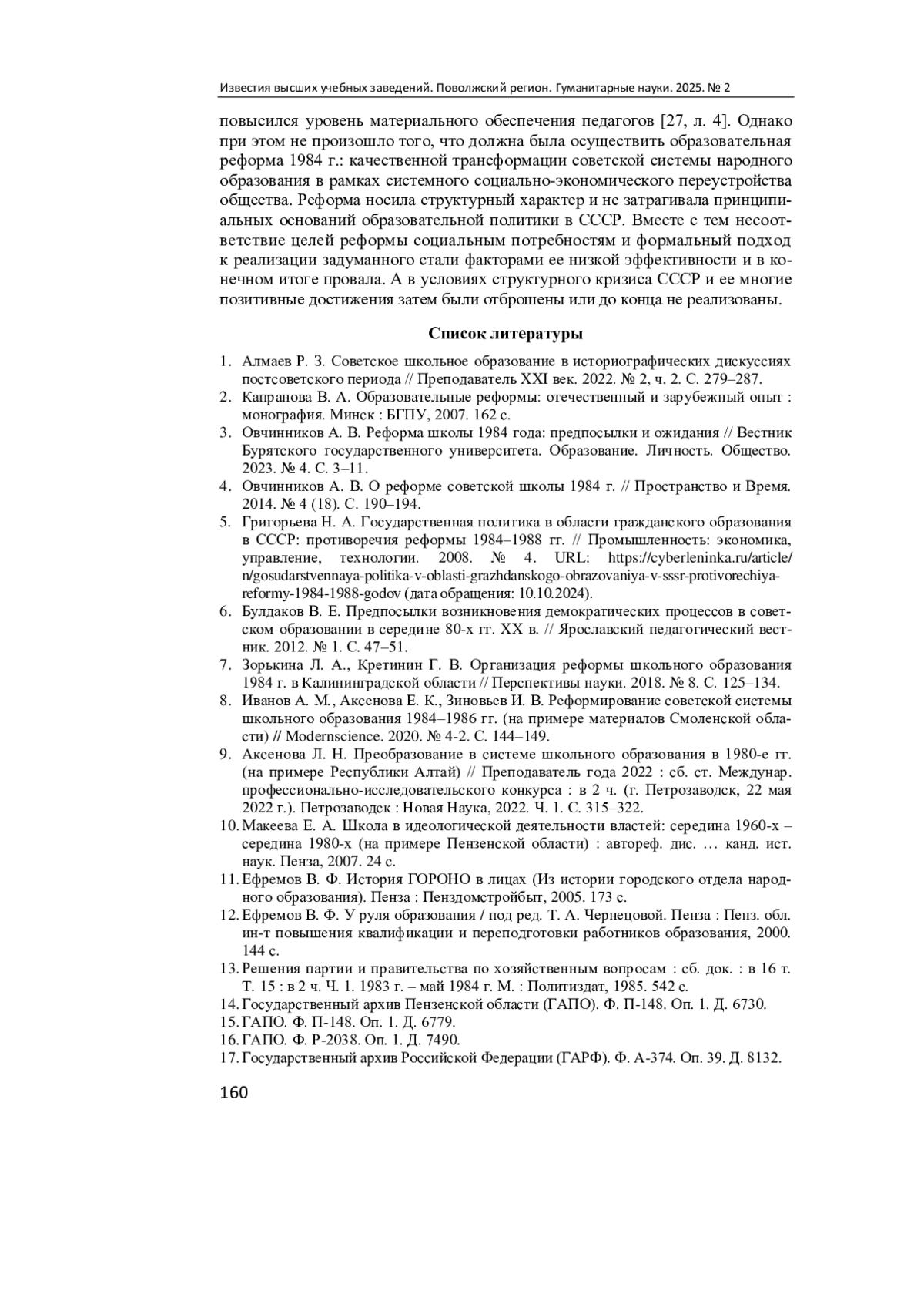 3. Овчинников А. В. Реформа школы 1984 года: предпосылки и ожидания // Вестник Бурятского государственного университета. Образование. Личность. Общество. 2023. № 4. С. 3-11. EDN: OEWKRM