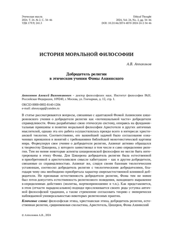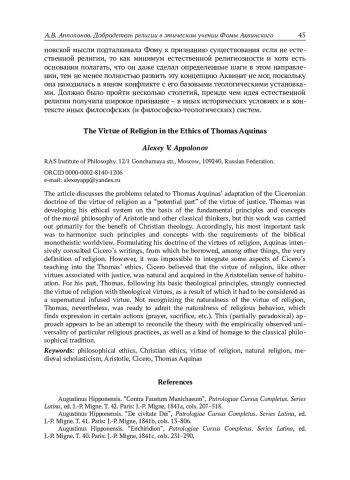 В статье рассматриваются вопросы, связанные с адаптацией Фомой Аквинским цицероновского учения о добродетели религии как «потенциальной части» добродетели справедливости. Фома разрабатывал свою этическую систему, опираясь на фундаментальные принципы и понятия моральной философии Аристотеля и других античных мыслителей, однако эта его работа осуществлялась прежде всего в интересах христианской теологии. Соответственно, его важнейшей задачей было согласование означенных принципов и понятий с требованиями библейской монотеистической картины мира. Формулируя свое учение о добродетели религии, Аквинат активно обращался к творчеству Цицерона, у которого заимствовал в том числе и само определение религии. Тем не менее некоторые аспекты цицероновской философии не могли быть интегрированы в этику Фомы. Для Цицерона добродетель религии была естественной и приобретенной в аристотелевском смысле хабитуации – как и другие добродетели, связанные со справедливостью. Аквинат же, следуя своим базовым теологическим установкам, соотносил добродетель религии с теологическими добродетелями, благодаря чему она необходимо приобретала характер сверхъестественной влиянной добродетели. Не признавая естественность добродетели религии, Фома тем не менее был готов допустить естественность религиозного поведения, находящего выражение в определенных действиях (молитва, жертвоприношение и т. п.). Как представляется, в этом (отчасти парадоксальном) подходе прослеживается своего рода уступка античной философской традиции, а также стремление согласовать теорию с эмпирически наблюдаемой универсальностью некоторых религиозных практик.